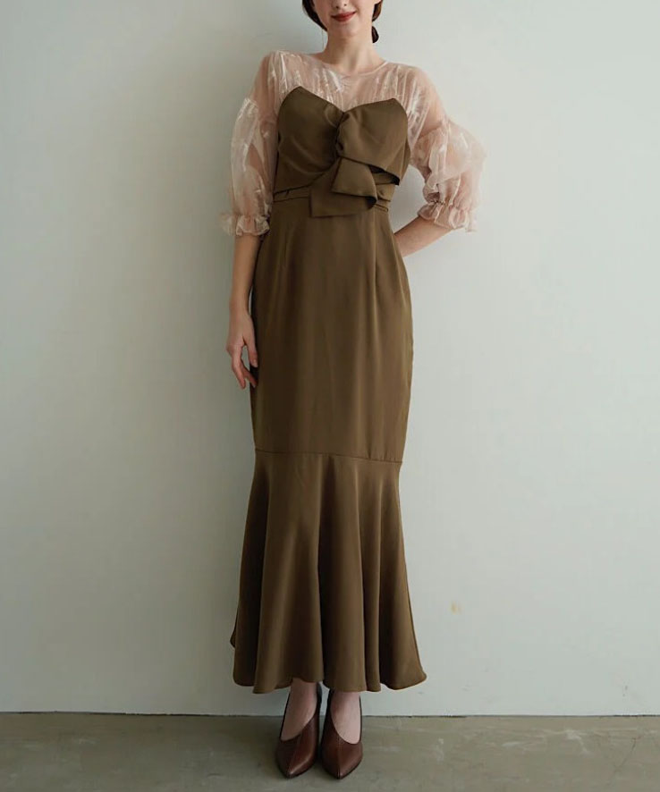 特徴:シアーなパフスリーブが印象的なブラウンドレス。2サイズでややゆったりとしたフィット感。