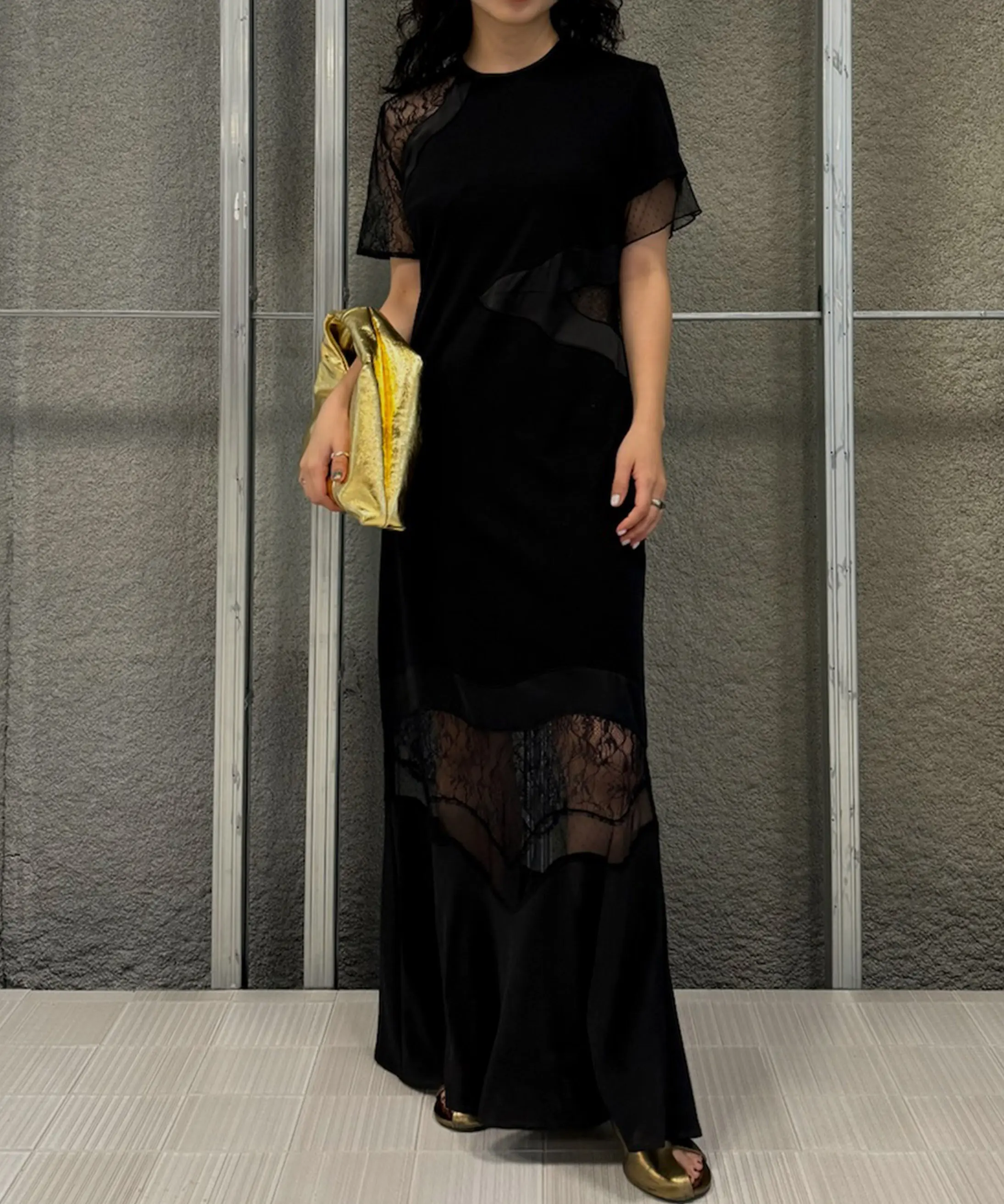 特徴:アシンメトリーなレースデザインが特徴的なブラックドレス。エレガントで、シルエットも美しい一着です。