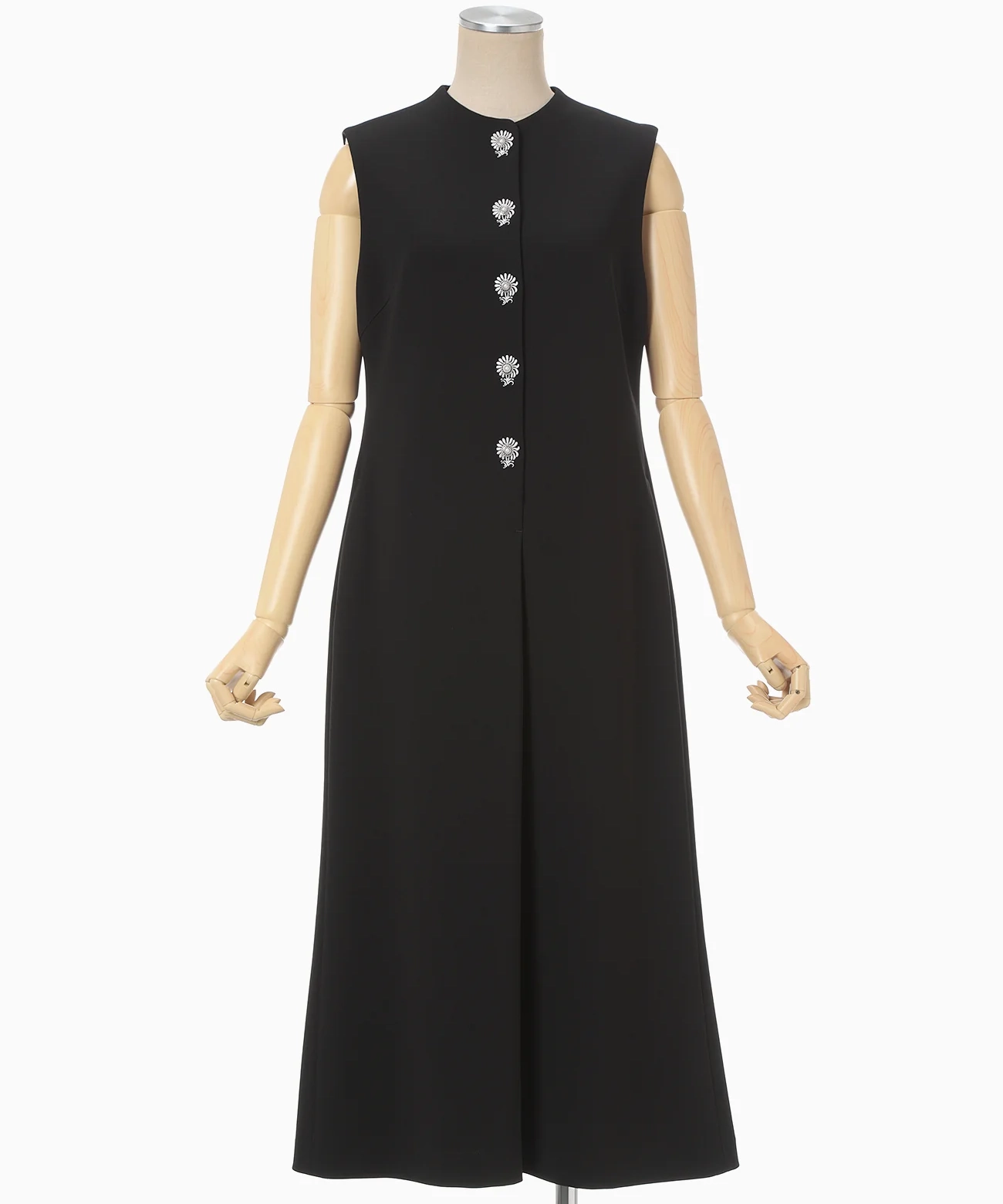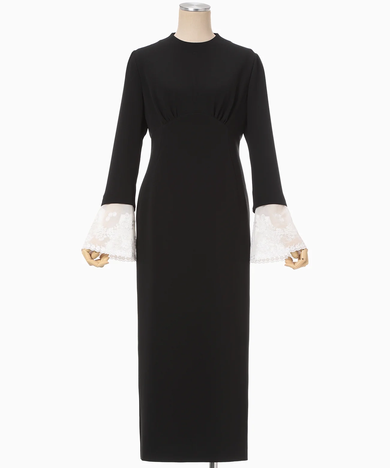 【2サイズ】Back Satin Crepe Georgette Embroidered Cuffs I-Line Dress - black