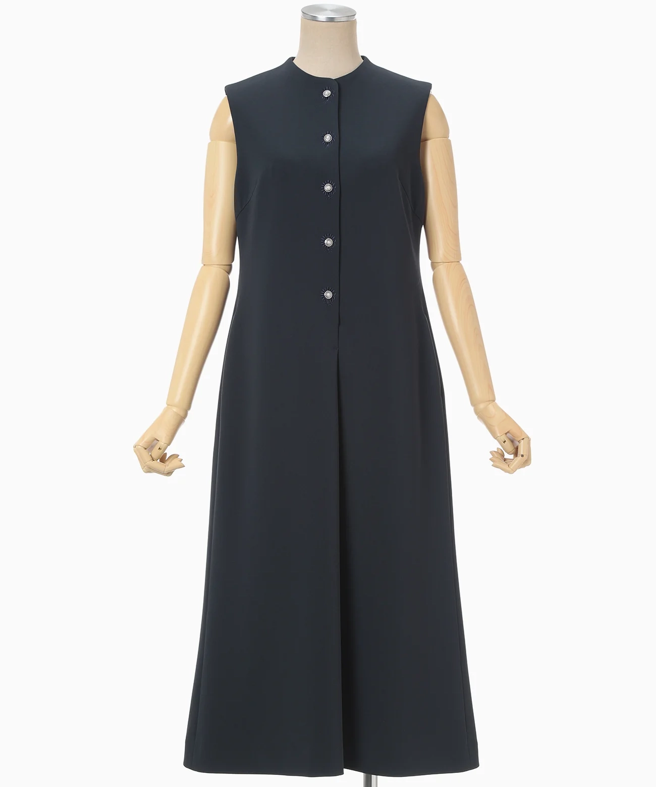 【2サイズ】Acetate Polyester Embroidered Buttonholes Sleeveless Dress - navy × white