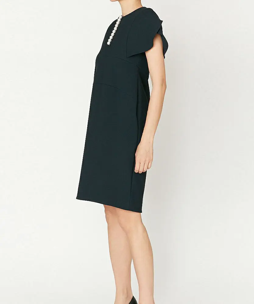 花びらを重ねたようなペタルスリーブが女性らしく華奢な印象に仕上げるドレス。デコルテラインを美しく演出する胸元のスリットラインには、YOKOCHANオリジナルのパールをあしらい華やかに。程よい厚みとマットな質感の生地を使用しており、美しい曲線の立体デザインを堪能できる一着。