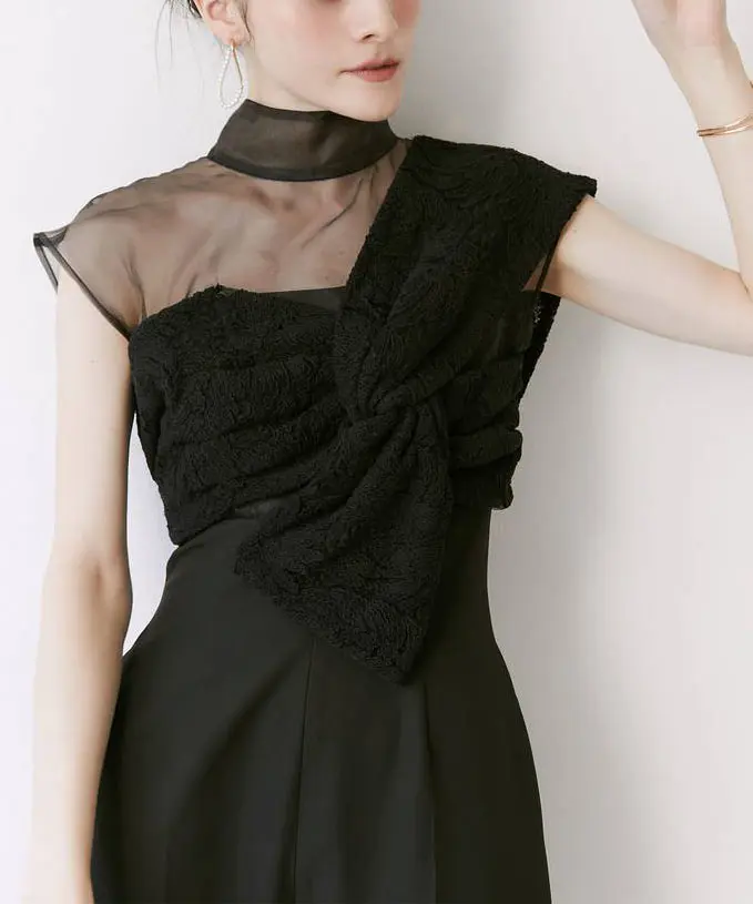 胸元でツイストされたレース素材のリボンがアシンメトリーにアクセントになったパンツドレス。