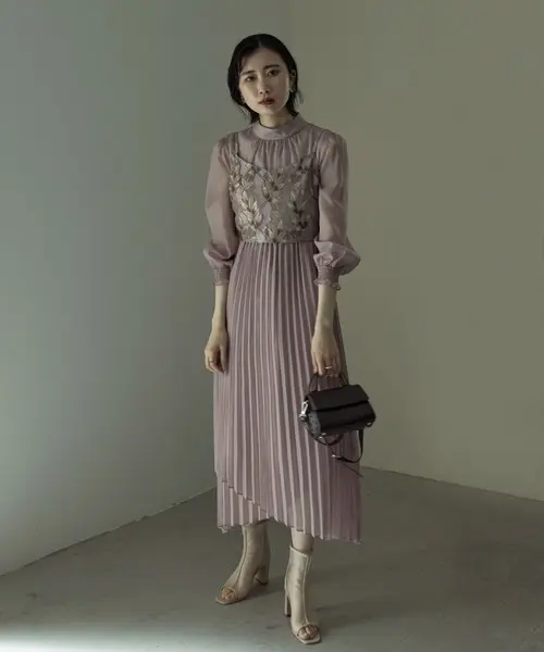 上品なボトルネック、高めの位置で切り替えたプリーツが華奢見せと脚長効果をもたらす、大人可愛いワンピース。