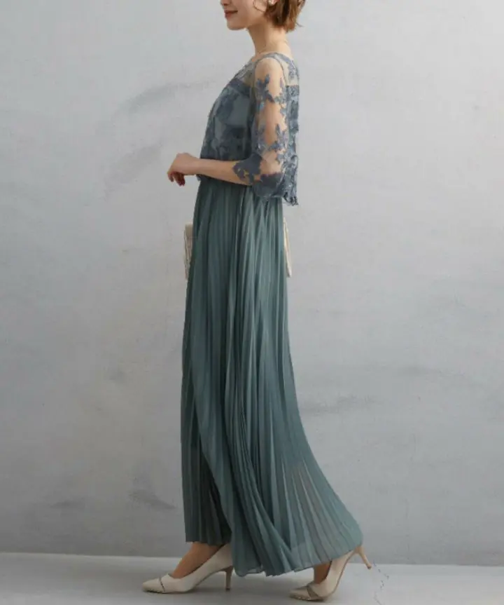 プリーツスカートが歩くたびにエレガントに動き、全体的に上品なデザインのドレスです。袖付きのため二の腕のカバーも◎。着脱しやすい後ろファスナーの仕様です。大人な女性にぴったりのドレスです。