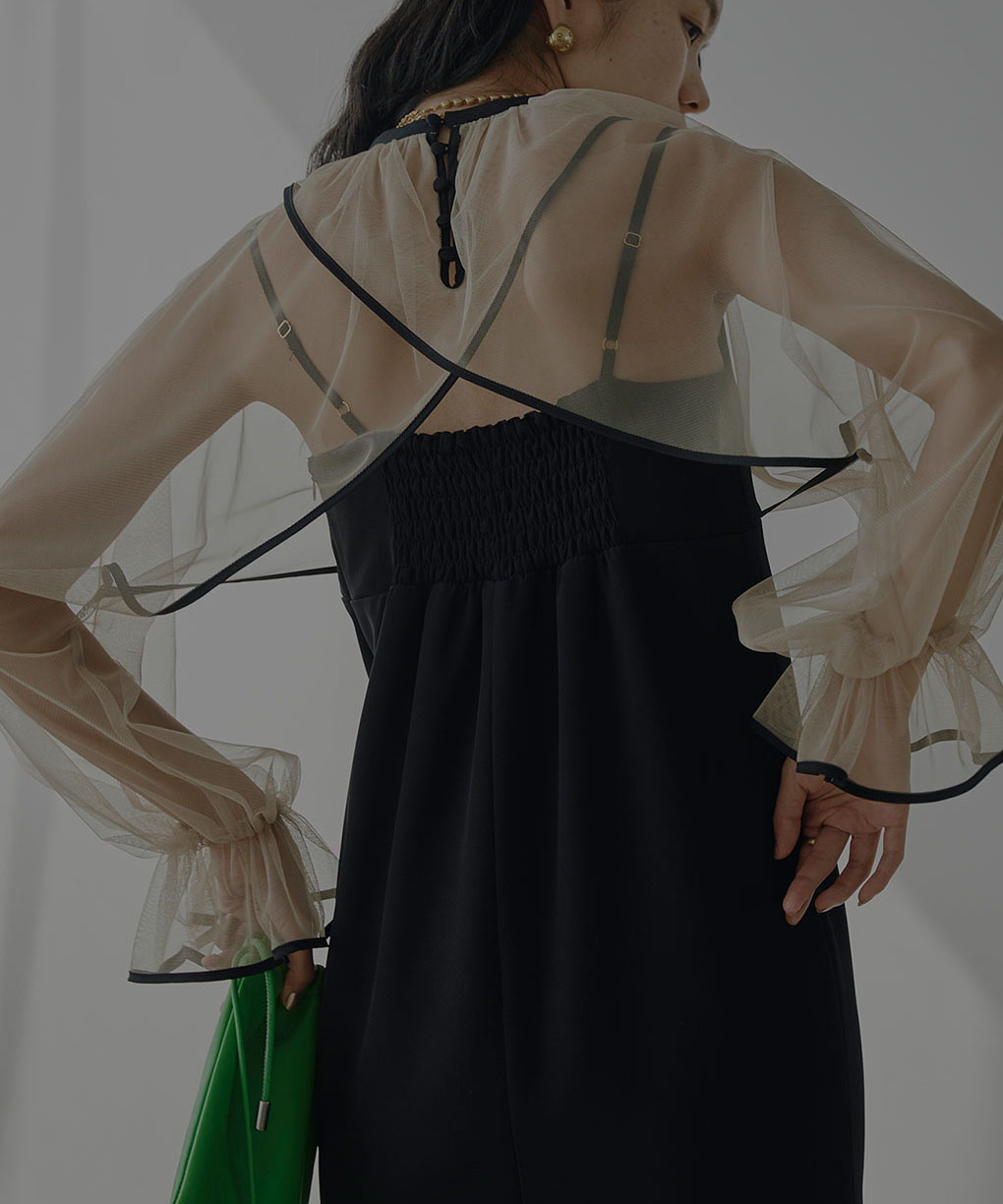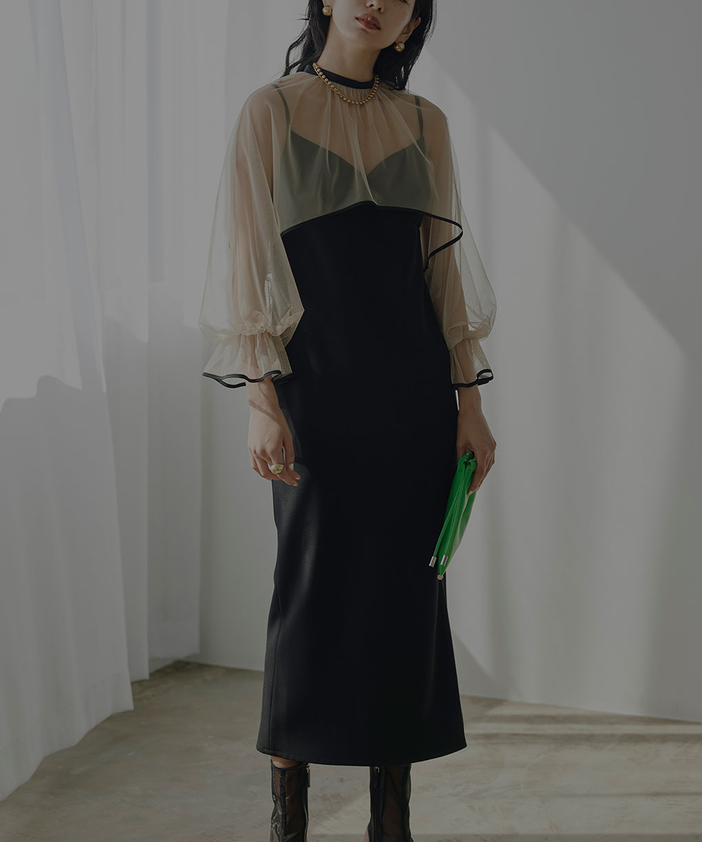Iラインの美シルエットなドレスと、シアーなチュールトップスの相性が抜群。