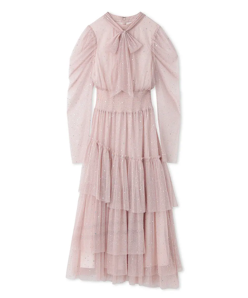 キラキラと輝くラメが、ロマンティックなムードを盛り上げるドレス。ウエストにシャーリングをあしらって、メリハリの効いた仕上がりに。キュッと結んだボウタイも顔周りに華やぎを添えるポイントです。