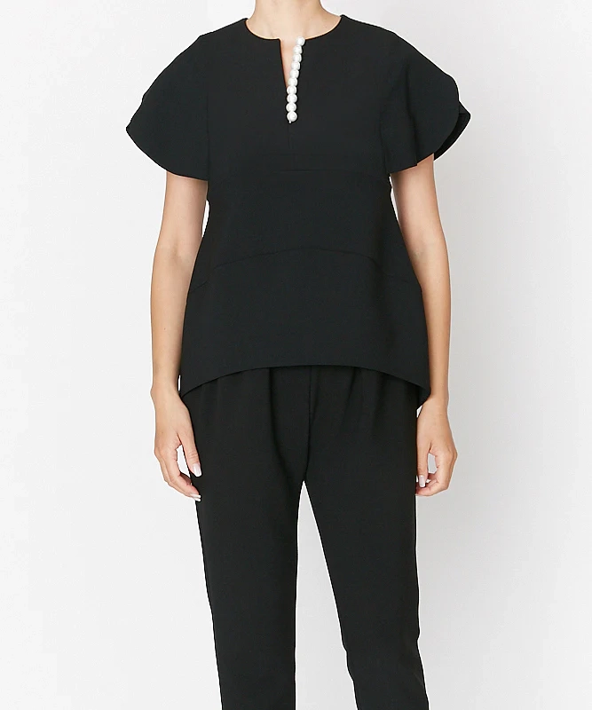 花びらを重ねたようなペタルスリーブが女性らしく華奢な印象に仕上げるブラウス。デコルテラインをすっきり美しく演出する深めのスリットラインには、YOKO CHANオリジナルのパールをあしらい華やかに。程よい厚みとマットな質感の生地を使用しており、美しい曲線の立体デザインを堪能できる一着。同素材のスカートやパンツとセットアップスタイルも楽しめます。