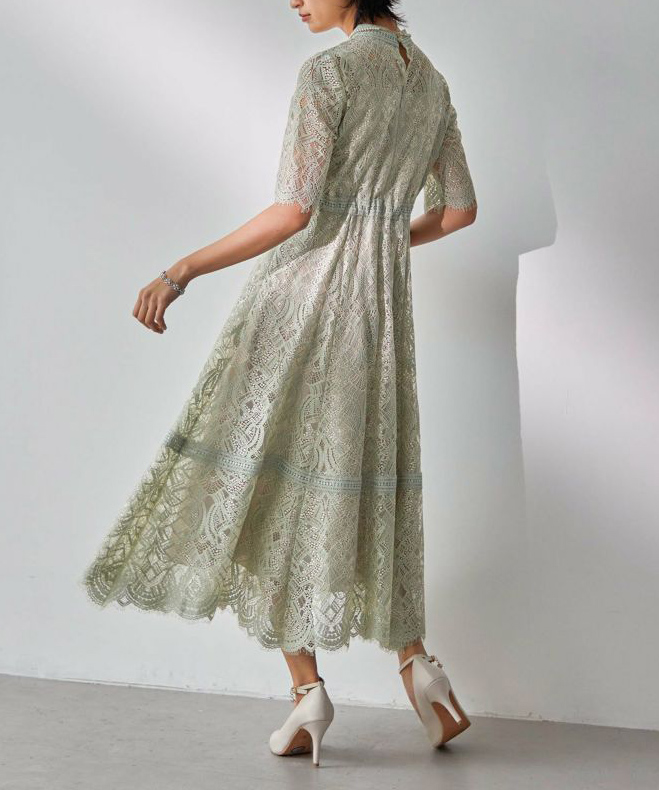 配色レースの生地が美しい、ハシゴレース切り替えワンピース。