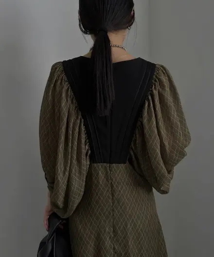 一枚で様になる幾何学柄のボリュームスリーブワンピース。