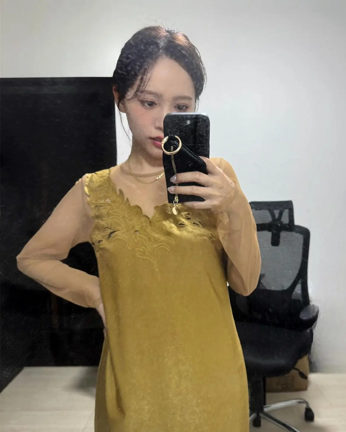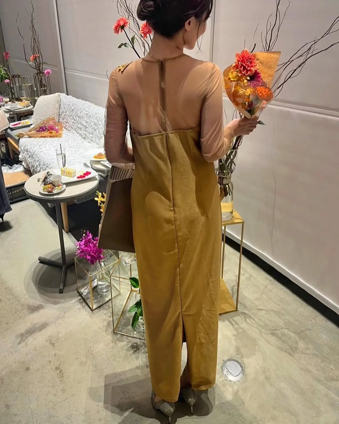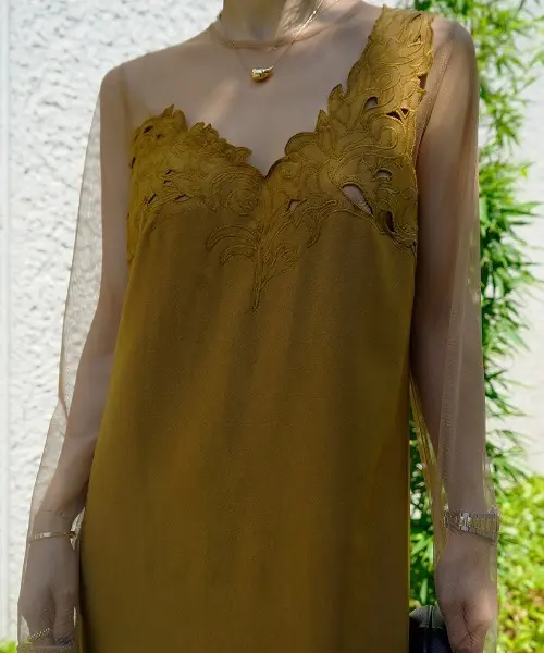 チュール素材のヘルシーな肌見せと、落ち感のあるシルエットが女性らしさを演出してくれます。