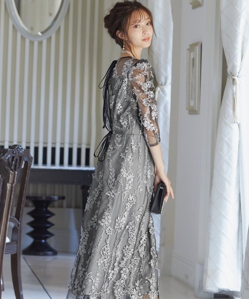 デコルテと袖がシアー素材になっていてる刺繍レースが特徴的な総レースドレス。