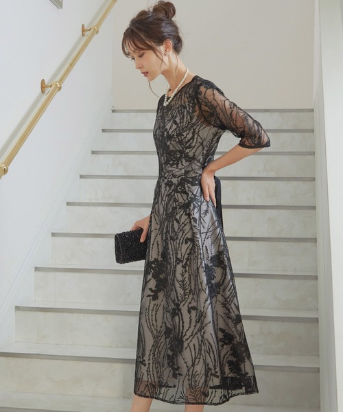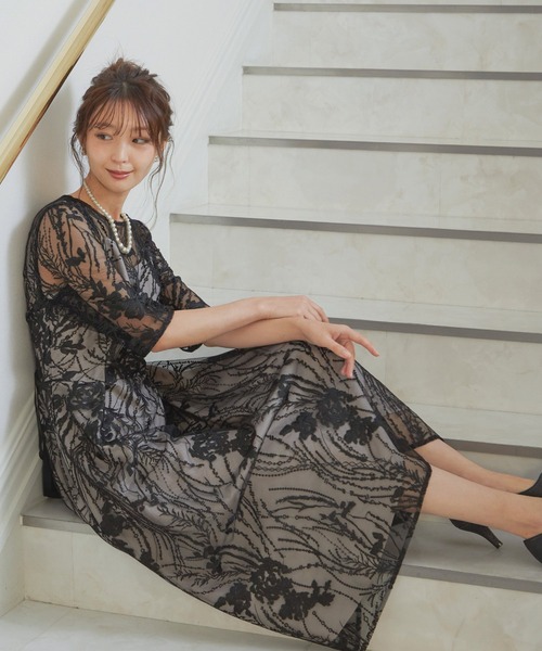大柄な刺繍レースで甘くなりすぎない上品ドレスです。