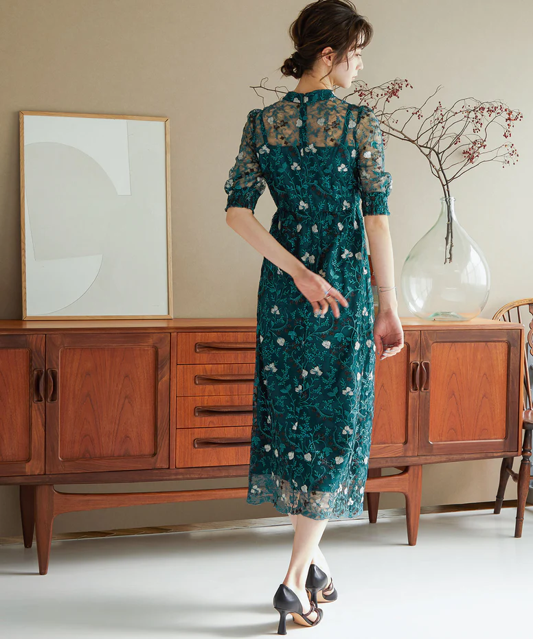 アンティーク調の刺繍レースが目を惹くパーティードレスです。