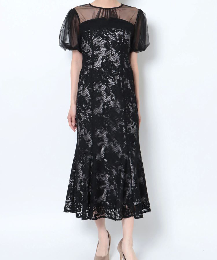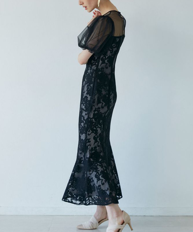 トップスと袖はシアーなチュールになっていて女性らしい抜け感を出した華やかなアイテムです。