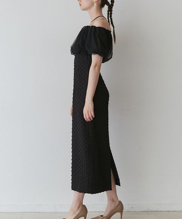 胸上からシアーに切り替えたIラインワンピースに、ボリューム感のあるチュールギャザーボレロがセットになったレイヤードドレス。