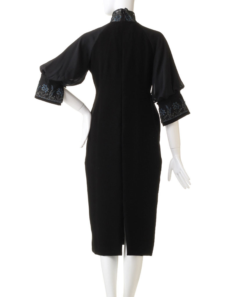 繊細なエンブロイダリーレースをあしらったミディ丈のドレス。