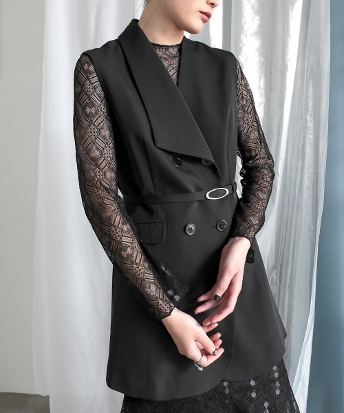 総レースが繊細なワンピースとジレがセットになったモード感のあるワンピースドレスです。ジレ部分のベルトでウエストを自由に調整することが出来ます。ジレにはポケットもついています。袖があるため二の腕をカバーしつつ、お洒落な雰囲気で、幅広い年代の方にご着用いただけます。