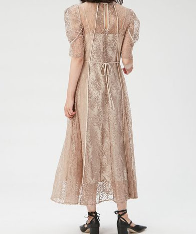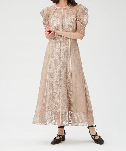 リーフ柄とスパンコールを刺繍したチュール生地が素敵なドレスです。控えめに広がるフレアシルエットがスタイルアップします。
