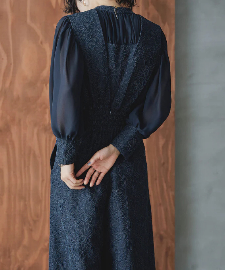 目を惹くレースを纏ったブラウスとサロペットのセットドレス。