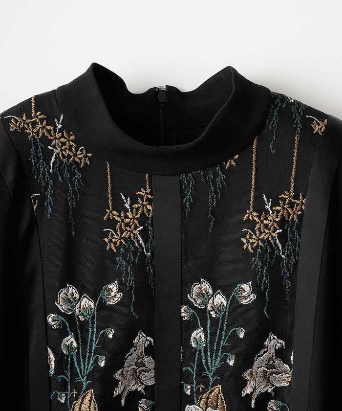 国産のエンブロイダリーレースを使用したFramed flowerシリーズのドレスは、ペンタスとセントポーリアをモチーフにしたリバイバルデザインで、Aラインシルエットに微光沢の切り替え、変形ラグランスリーブ、発色の良いアセテート素材を使い、オケージョンシーンに最適な1着です。