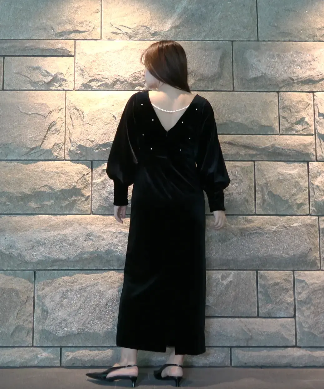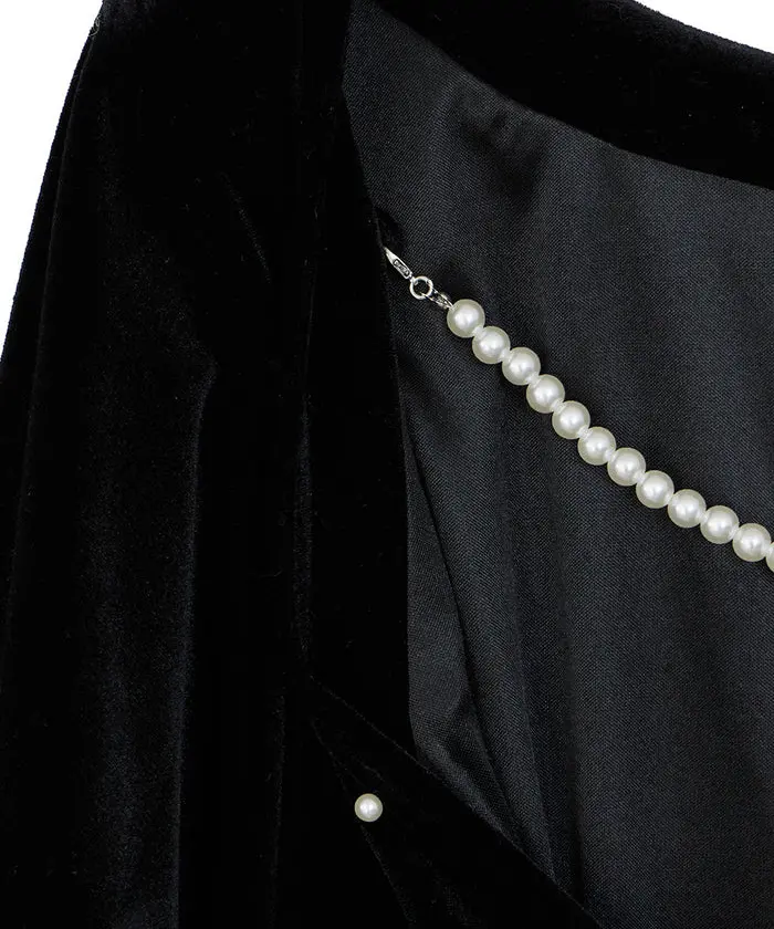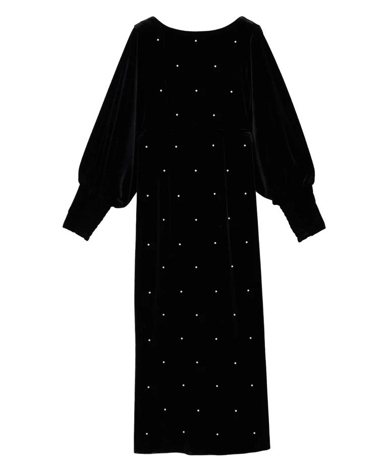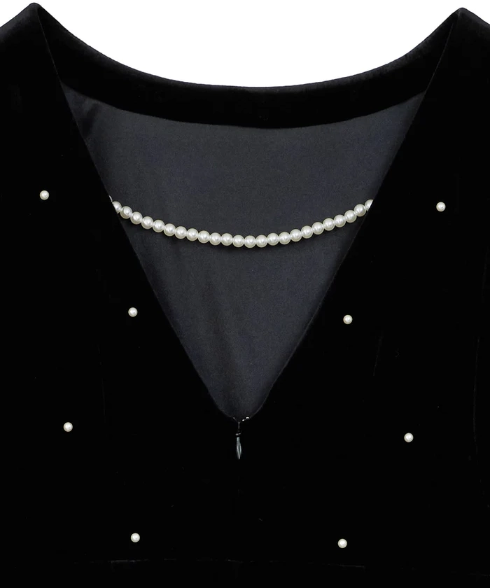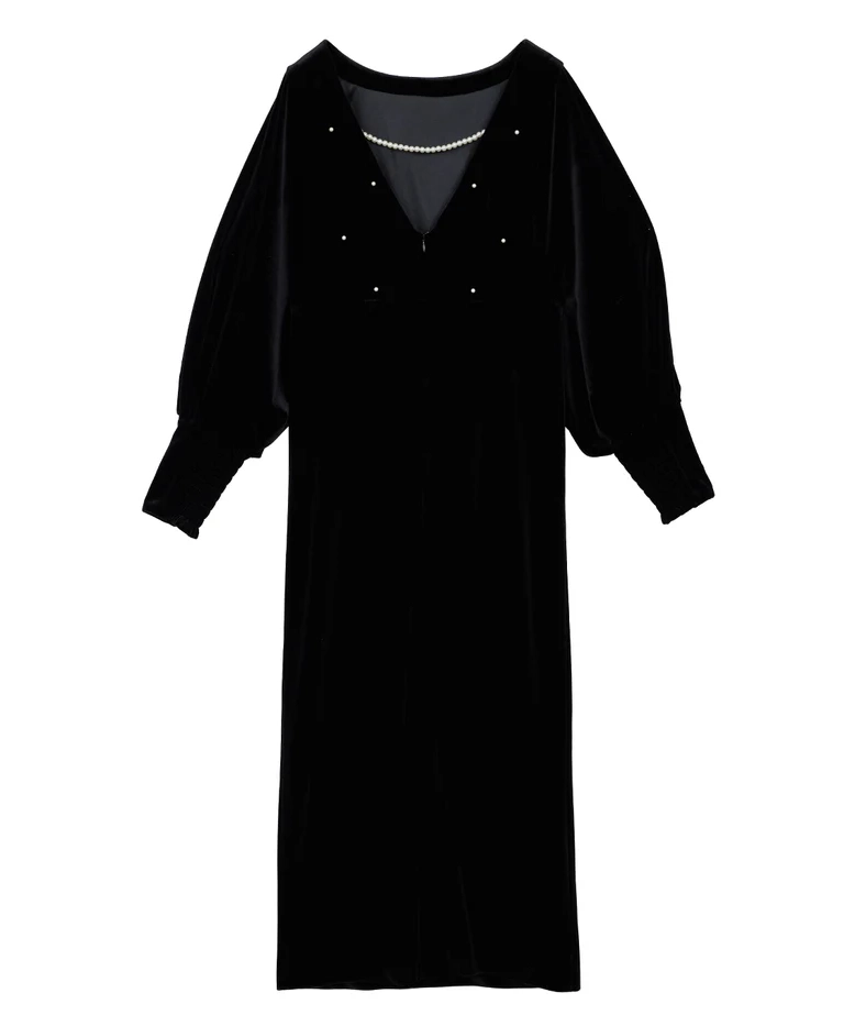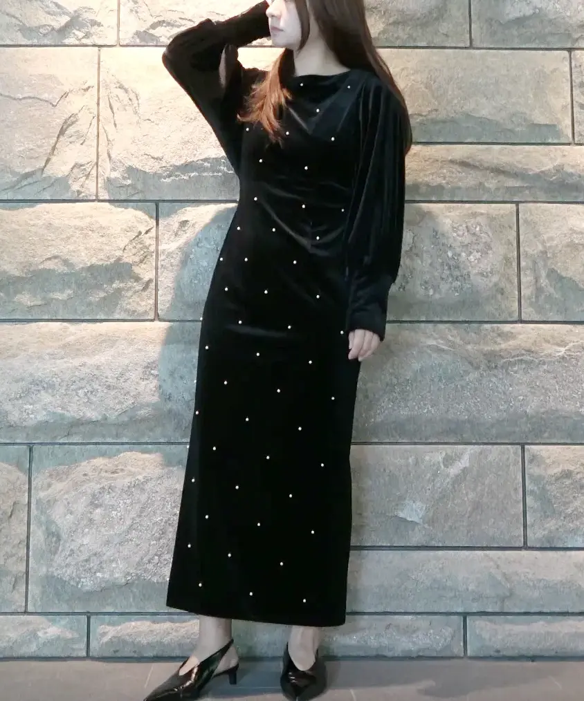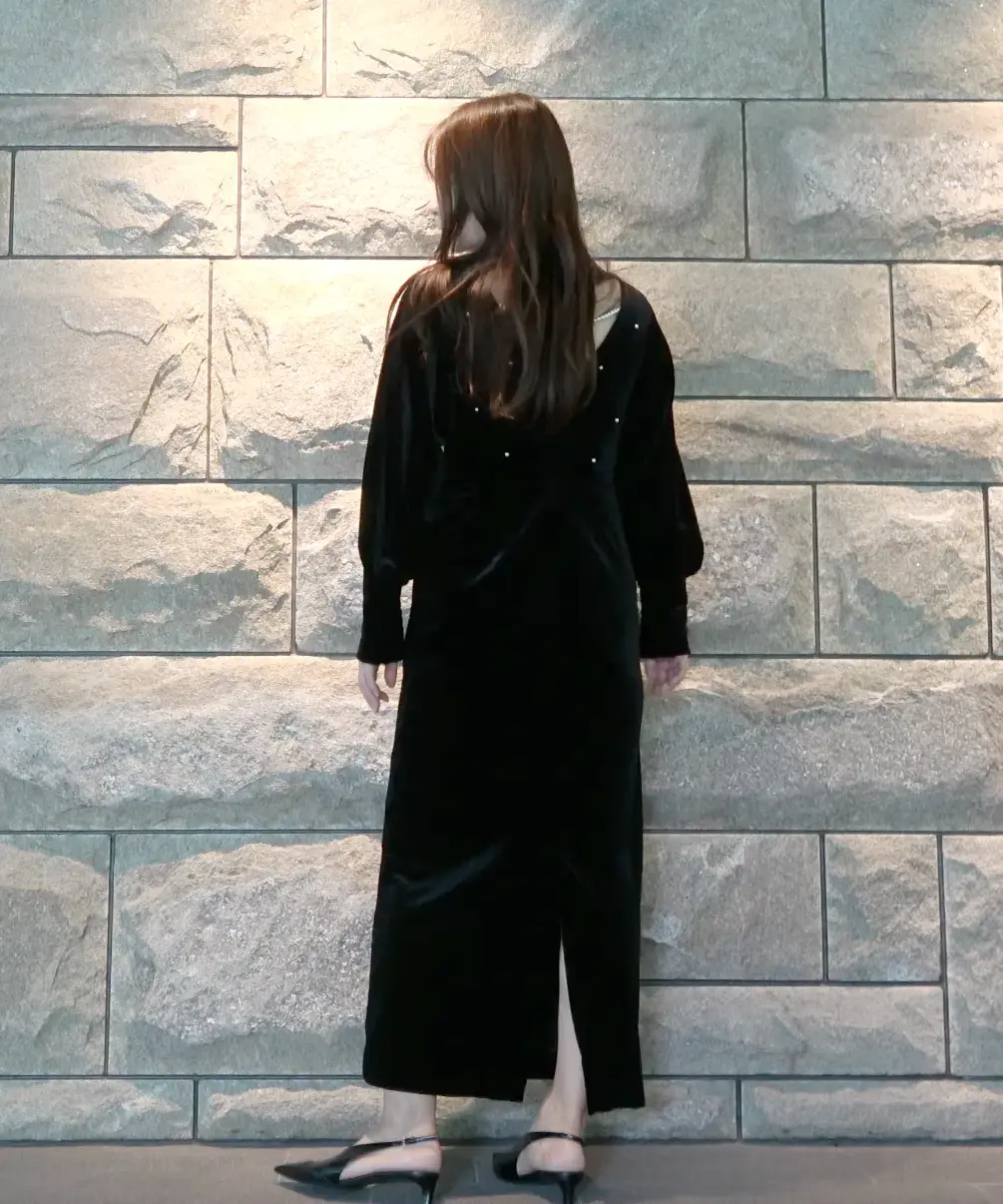 艶やかなベロア素材に全面パールが施されたドレスは、背中が大胆に開いた女性らしいデザインがポイントです。シャーリング入りの長めのカフス袖が華奢な部分を強調し、肩回りからバストにかけてゆとりがあるため、ストレスフリーな着心地で、取り外し可能なバックのパールチェーンが特徴の秋冬のオケージョンシーンにぴったりの一着です。