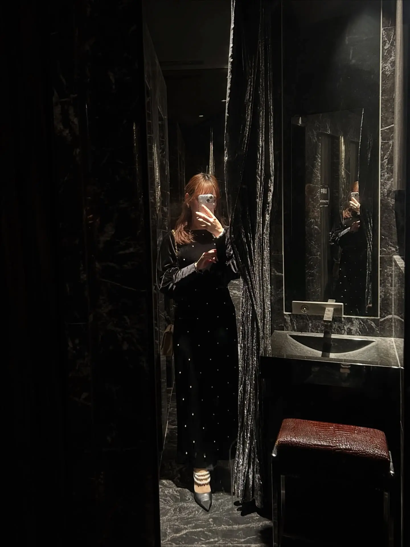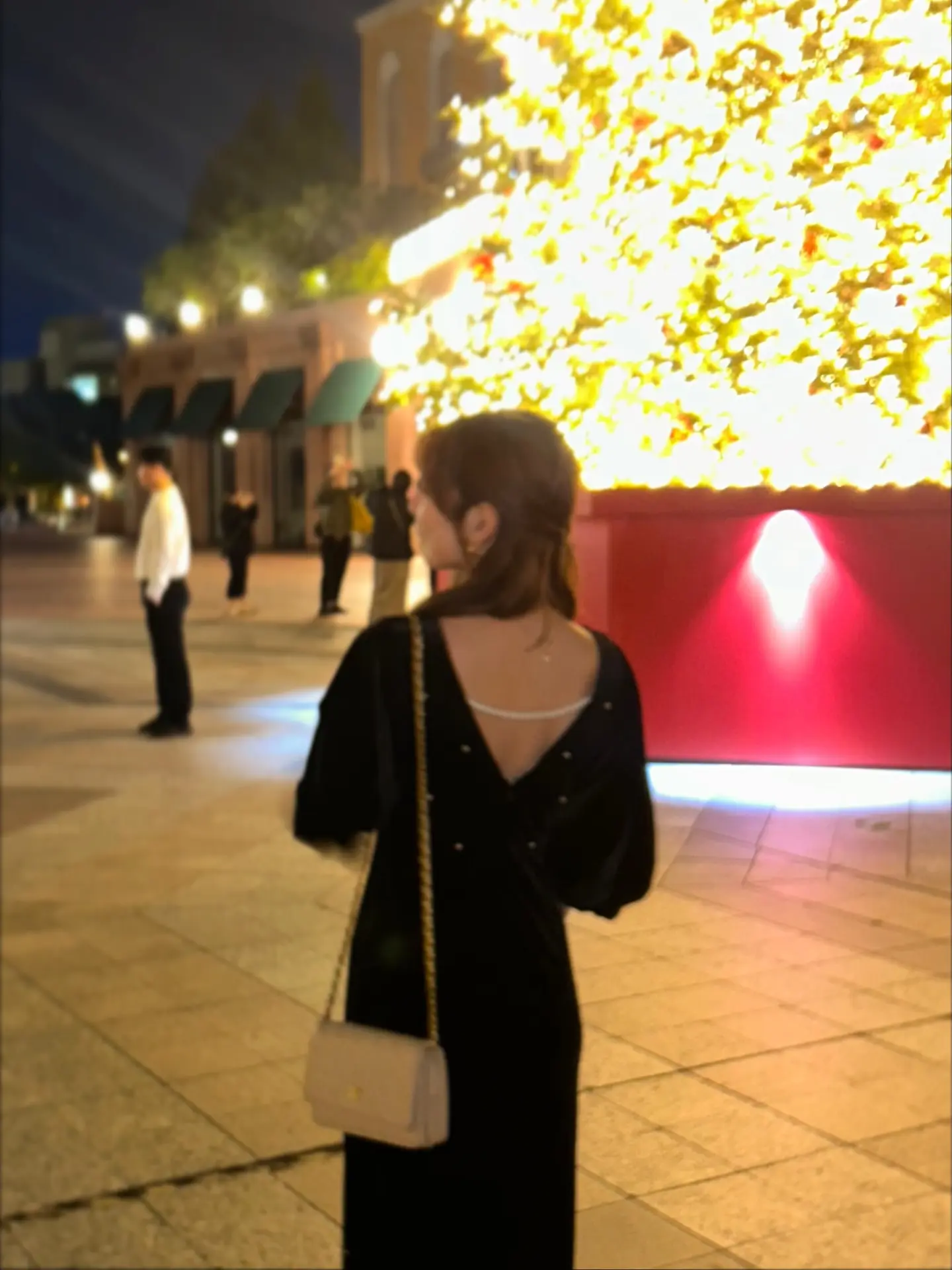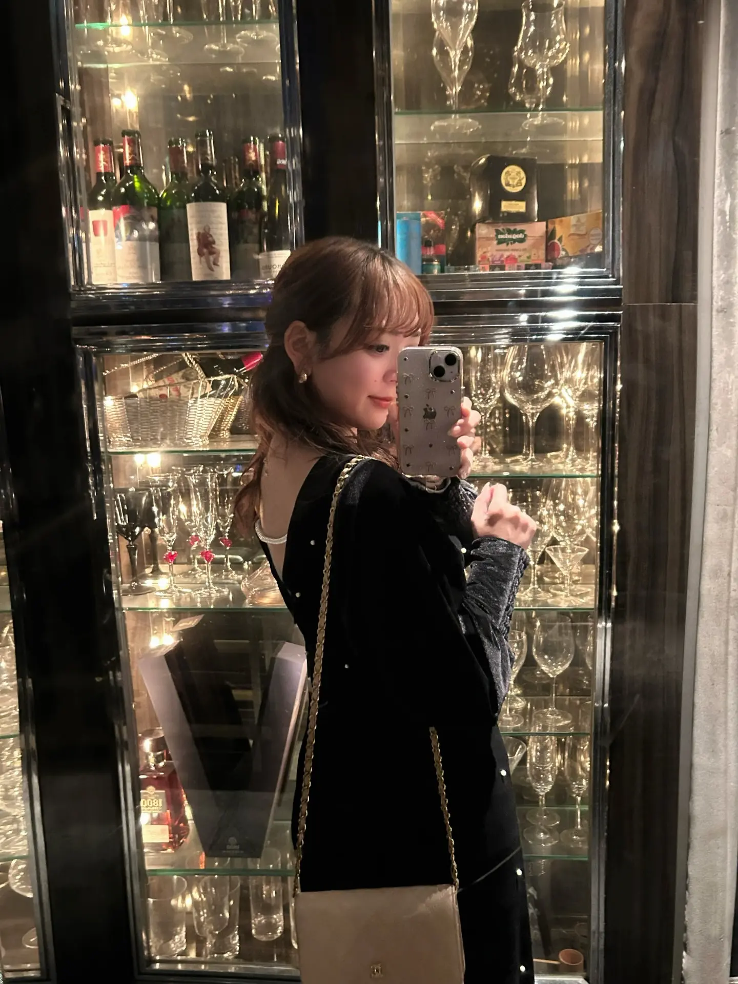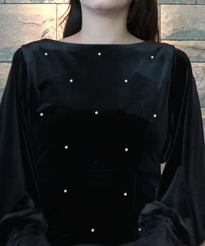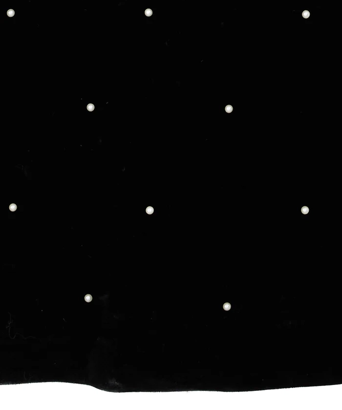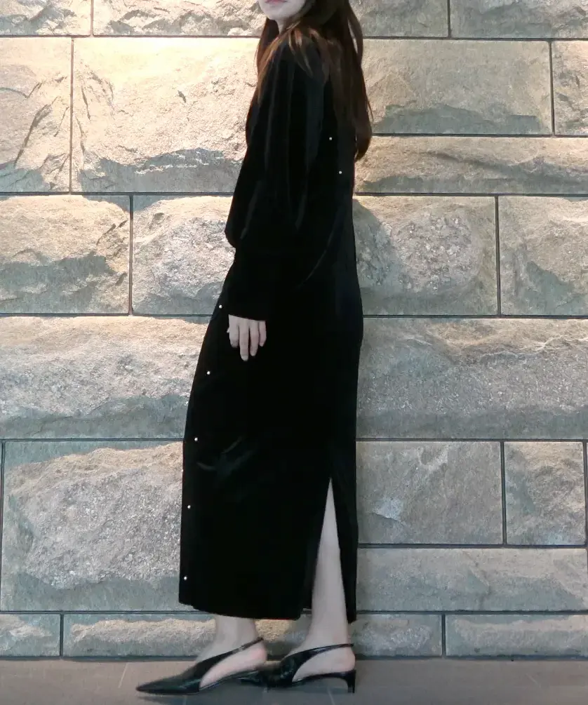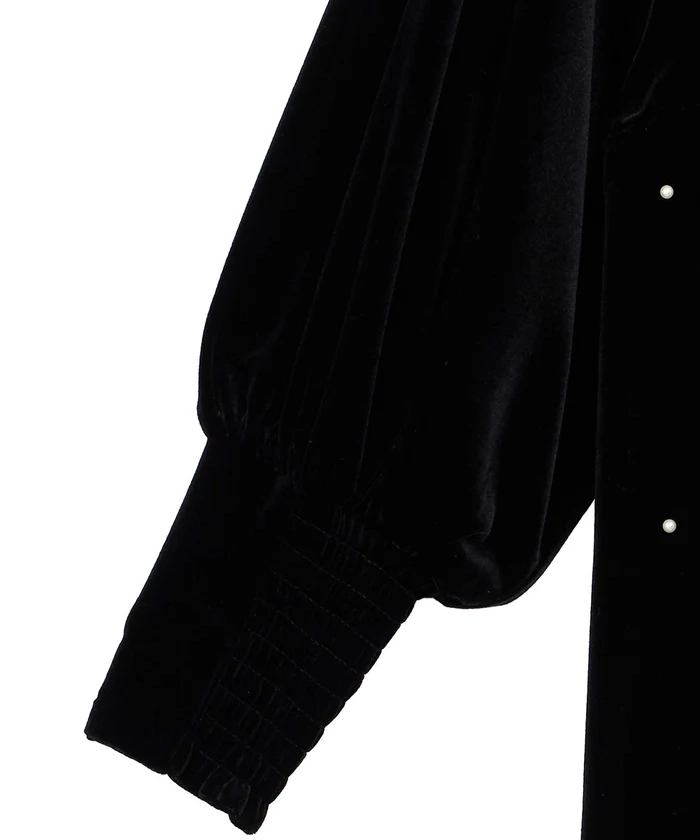 艶やかなベロア素材に全面パールが施されたドレスは、背中が大胆に開いた女性らしいデザインがポイントです。シャーリング入りの長めのカフス袖が華奢な部分を強調し、肩回りからバストにかけてゆとりがあるため、ストレスフリーな着心地で、取り外し可能なバックのパールチェーンが特徴の秋冬のオケージョンシーンにぴったりの一着です。
