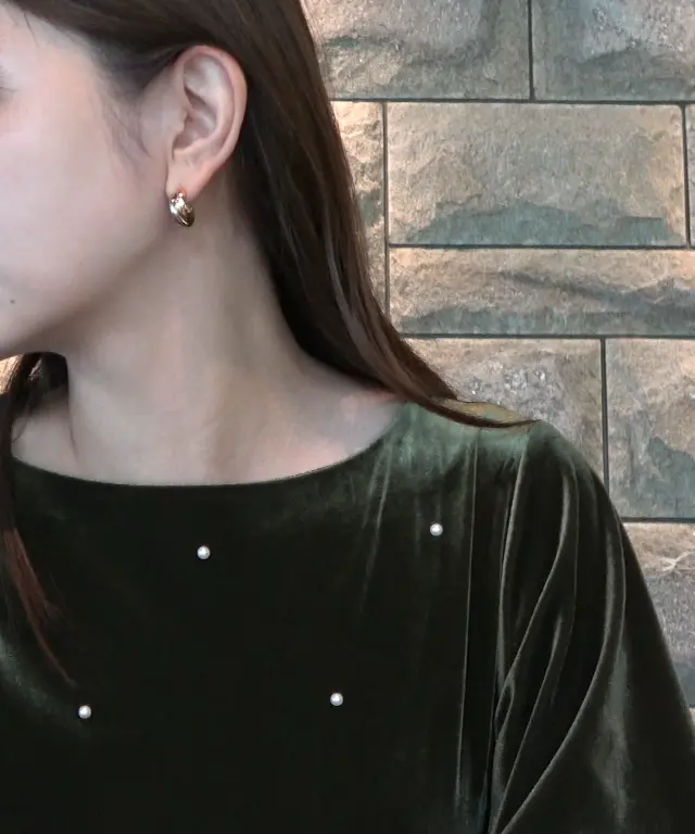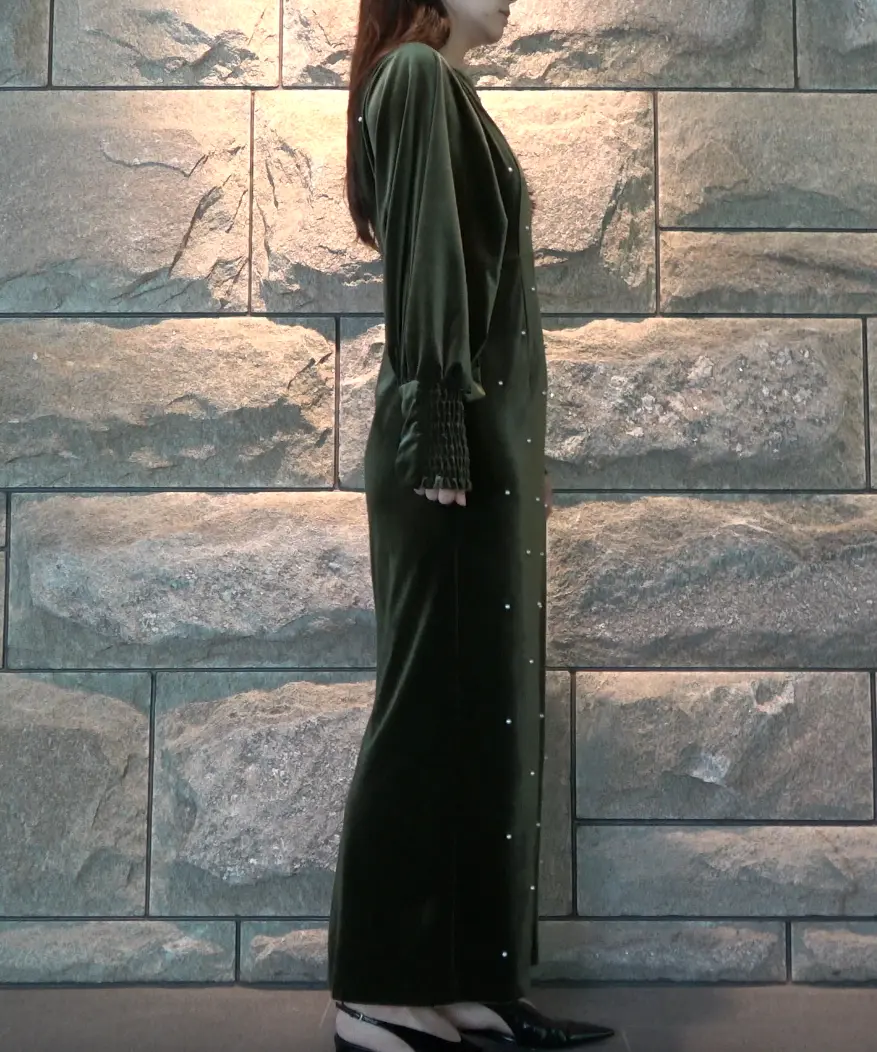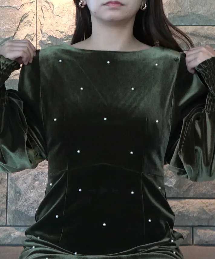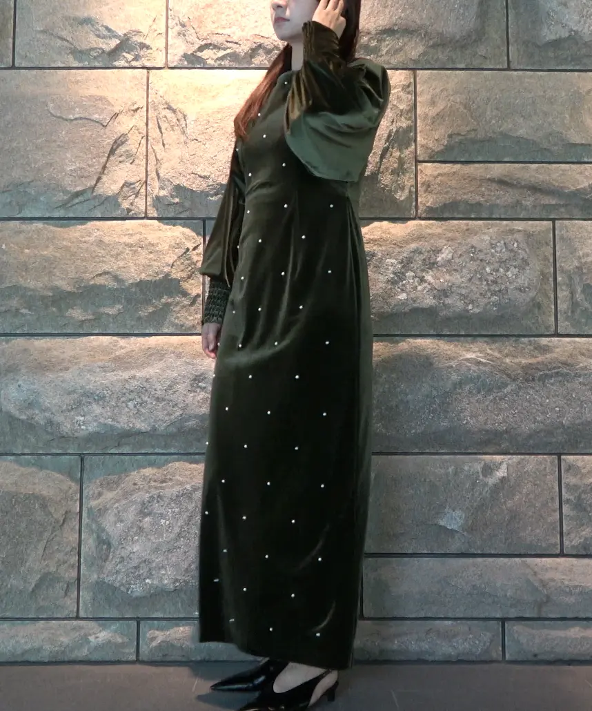 艶やかなベロア素材に全面パールが施されたドレスは、背中が大胆に開いた女性らしいデザインがポイントです。シャーリング入りの長めのカフス袖が華奢な部分を強調し、肩回りからバストにかけてゆとりがあるため、ストレスフリーな着心地で、取り外し可能なバックのパールチェーンが特徴の秋冬のオケージョンシーンにぴったりの一着です。