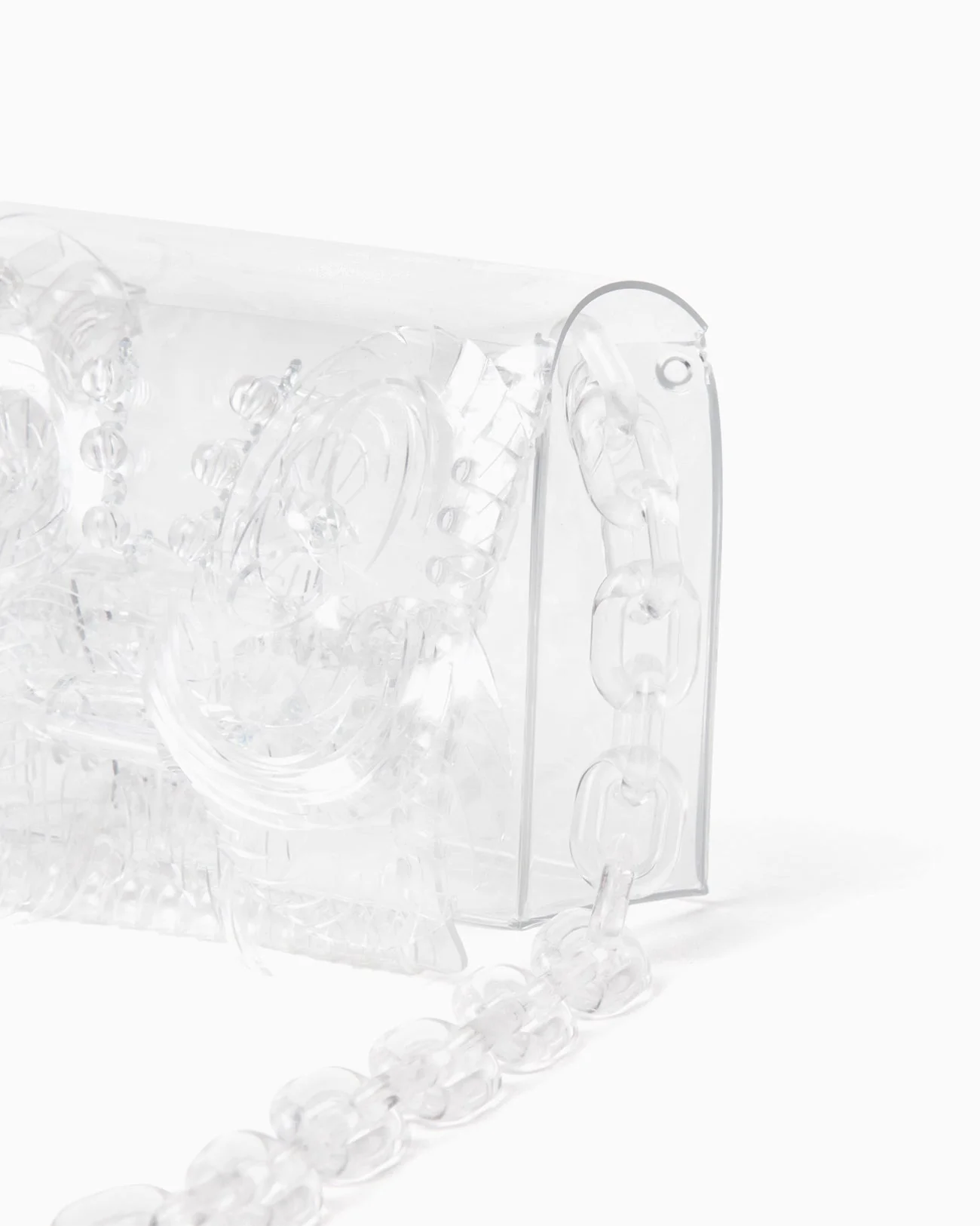 PVC素材の美しさとデザイナーの幼少期の冬景色からインスピレーションを受けたアイテムで、Mame Kurogouchiのシグネチャーシリーズです。職人の手作業によって組み立てられ、ガラスのような繊細な輝きと立体モチーフが氷柱を思わせ、持ち歩く彫刻のような存在感を放ちます。小さなチェーンとミニマルな本体がアクセサリーのように愛らしく、日常のスタイルに華やぎを添えるアイコニックなアイテムです。