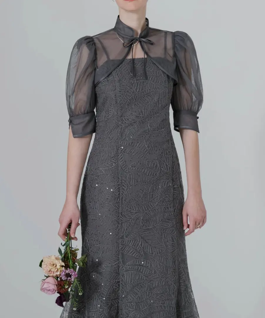 チュール素材を使用したボレロにボタニカル柄のキャミソールドレスをあわせたセットアップドレス。