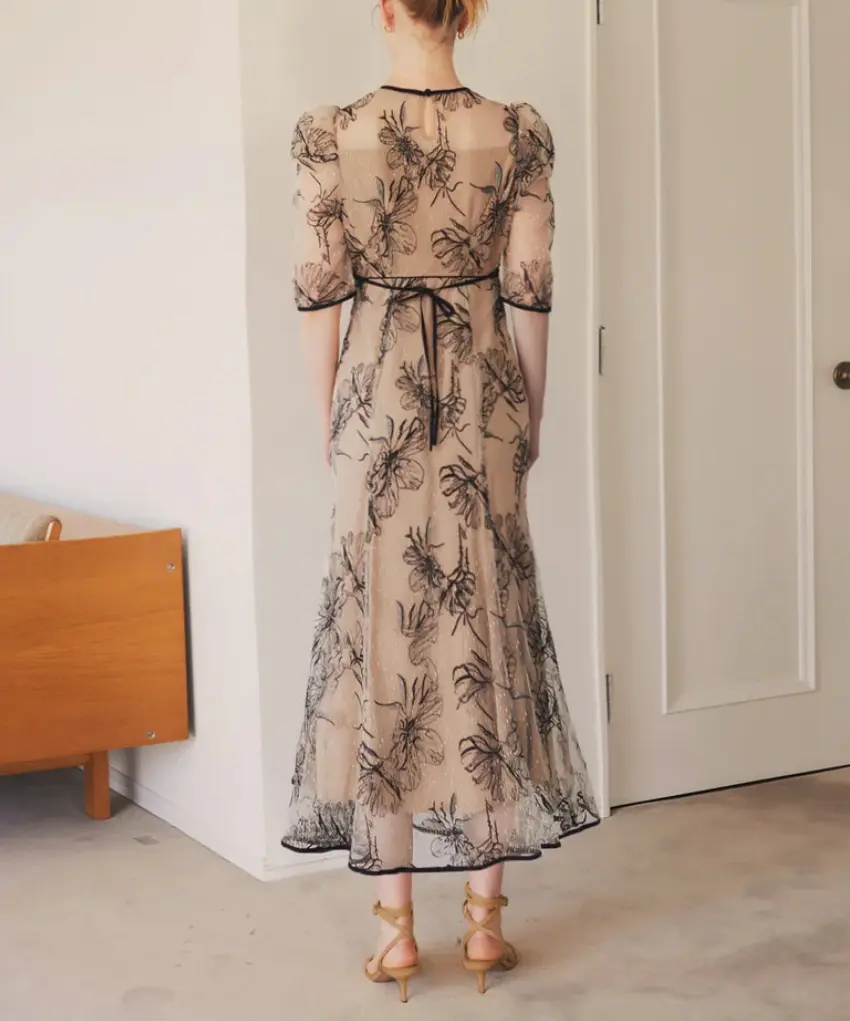 オリジナルの花柄刺繍がキュートなマーメイドワンピースドレス。