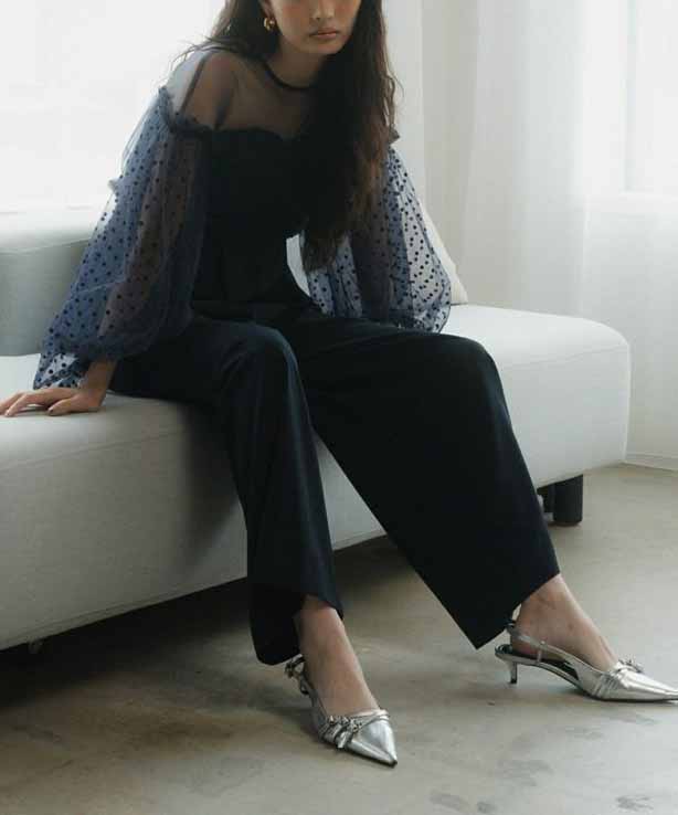 このドレスは、シアーなデコルテとフロッキードットの組み合わせが絶妙で、大人の甘さが程よく表現されています。バスト部分のチュール使いは繊細かつ立体的で、奥行きのあるデザインがとても印象的です。また、ジョーゼット生地のパンツ部分は落ち感が美しく、ワイドなシルエットがクールな印象をプラスしてくれます。袖のふわっとしたブラウジングデザインもポイントで、袖を通した瞬間に特別な気分になれる一着です。後ウエストがゴム仕様になっているので、リラックスした着心地でスタイルアップも叶うのが嬉しいです!