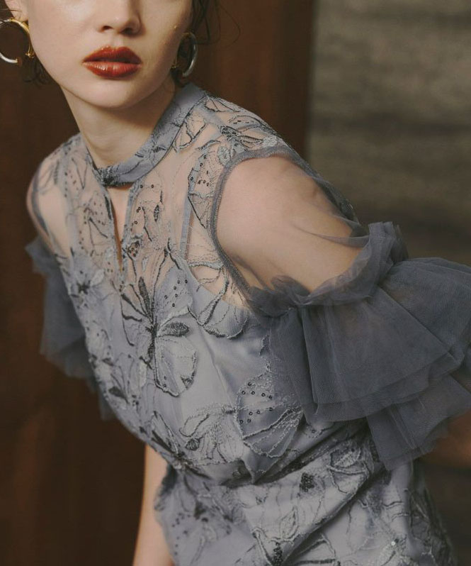 程よいハリと柔らかさのあるナイロンチュールを使用し、螺旋状のチュールフリルがボリュームたっぷりで華やかな印象です。裾に向かって細くなるペンシルラインのシルエットが女性らしさを引き立てるのはもちろん、ちびスタンドカラーがクラシカルな雰囲気を醸し出し、デコルテ部分のキーネック風カットが程よい抜け感を演出しています。さらに、ウエストに施されたタックディテールで体型を問わず着心地良く、スタイルアップ効果も期待できるドレスです。