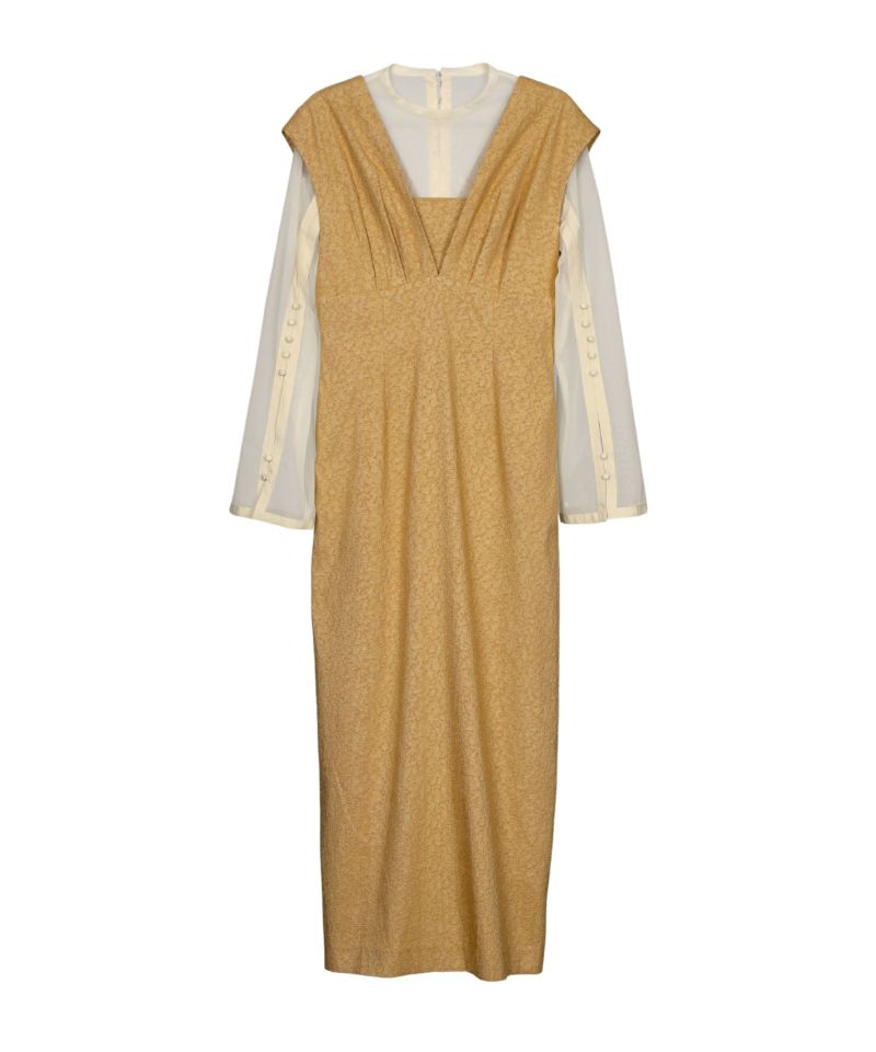高級感あふれるジャガード素材のワンピースと、くるみボタンが施されたチュールインナーのセットは、それぞれ単品でも使える汎用性の高いアイテムです。ワンピースは深めのVネックと切替デザインでシャープかつスタイルアップを叶え、取り外し可能な胸当てで様々なシーンに対応可能。チュールインナーはスリットスリーブとしても活用でき、シーンに応じた多彩な着こなしが楽しめる魅力的なセットアップです。