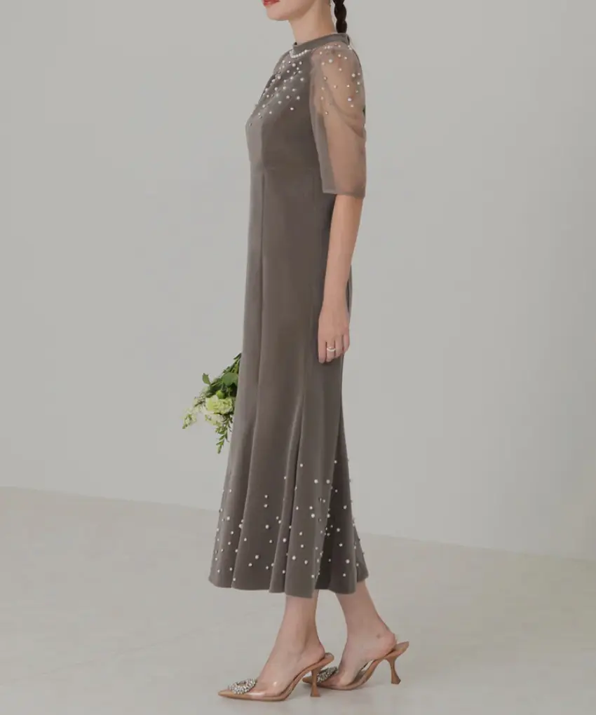 パールとビジューの異なる輝きが施されたドレスは、動くたびに華やかさを演出。