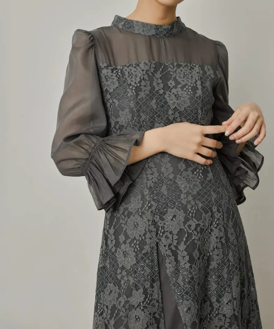 微細なラメ糸を練り込んだフラワーレースとオーガンジー素材をレイヤード風に仕立てたオケージョンドレス。
