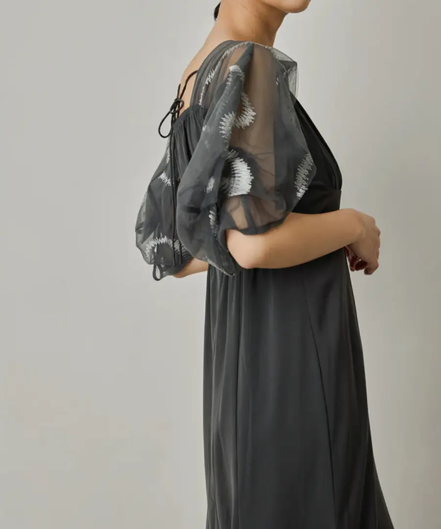 柔らかなチュールにニュアンス感たっぷりのグラフィティ柄の刺繍を施したスリーブドレス。