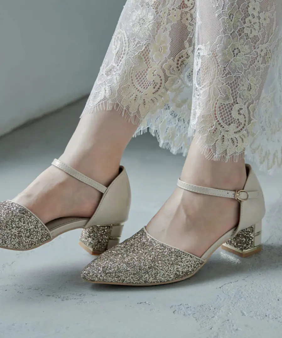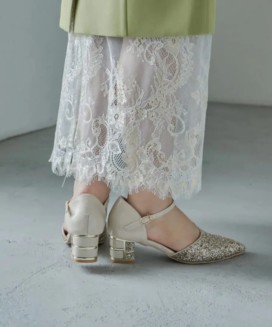 グリッターとエナメルを組み合わせ、足元を華やかに演出してくれるチャンキーヒールパンプス。