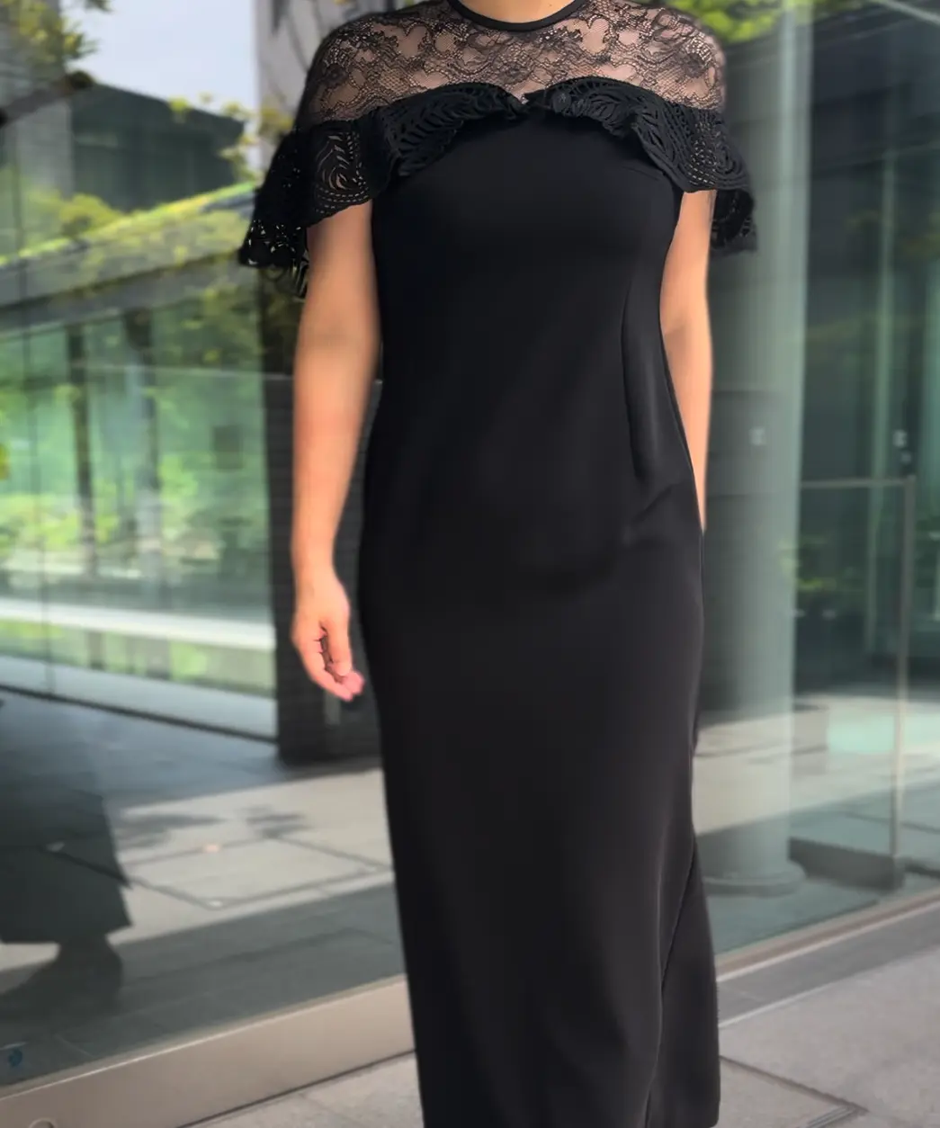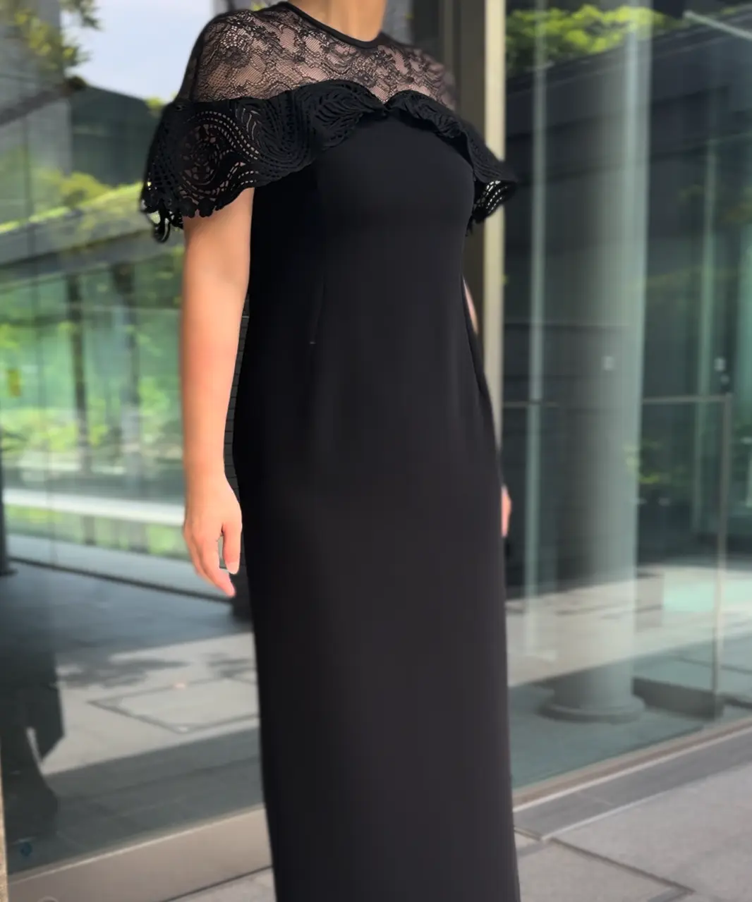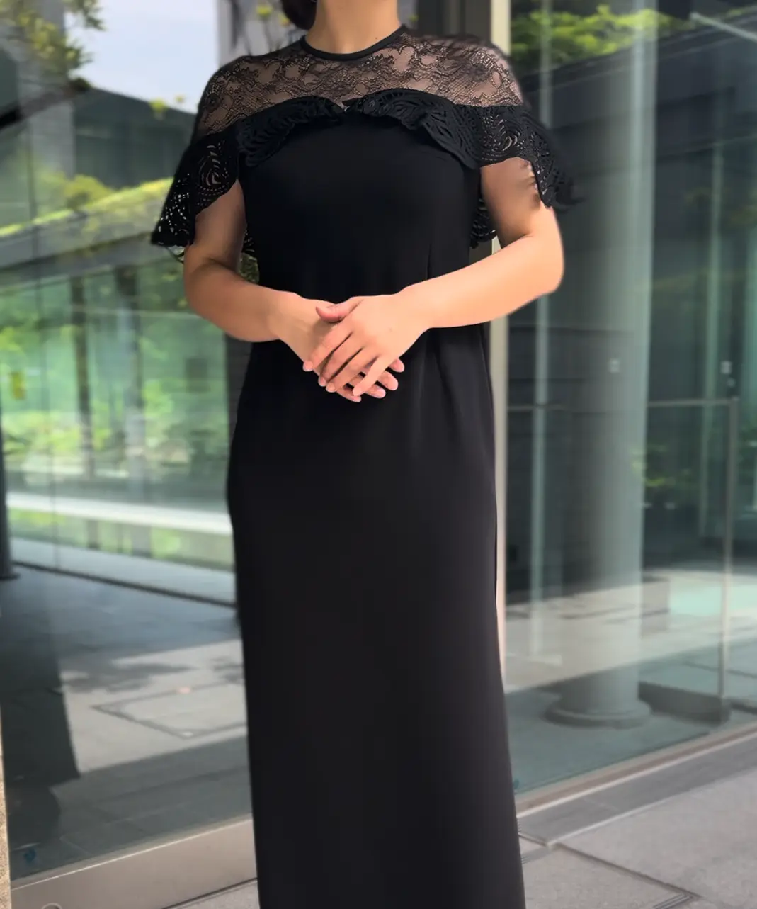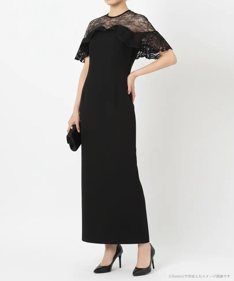 当店イチオシのラッセルレースドレスをご紹介します!トリアセテートとポリエステルのジョーゼット素材が、ストレッチ性と速乾性を両立。接触冷感機能付きでシワになりにくく、お手入れも簡単です。デコルテには自慢の花柄ラッセルレースと刺繍をあしらい、首元から肩にかけての可憐さが魅力。シェイプされたウエストから流れるシルエットが美しい縦ラインを強調し、着るだけでスタイルアップ!特別な日に着たい一着です。