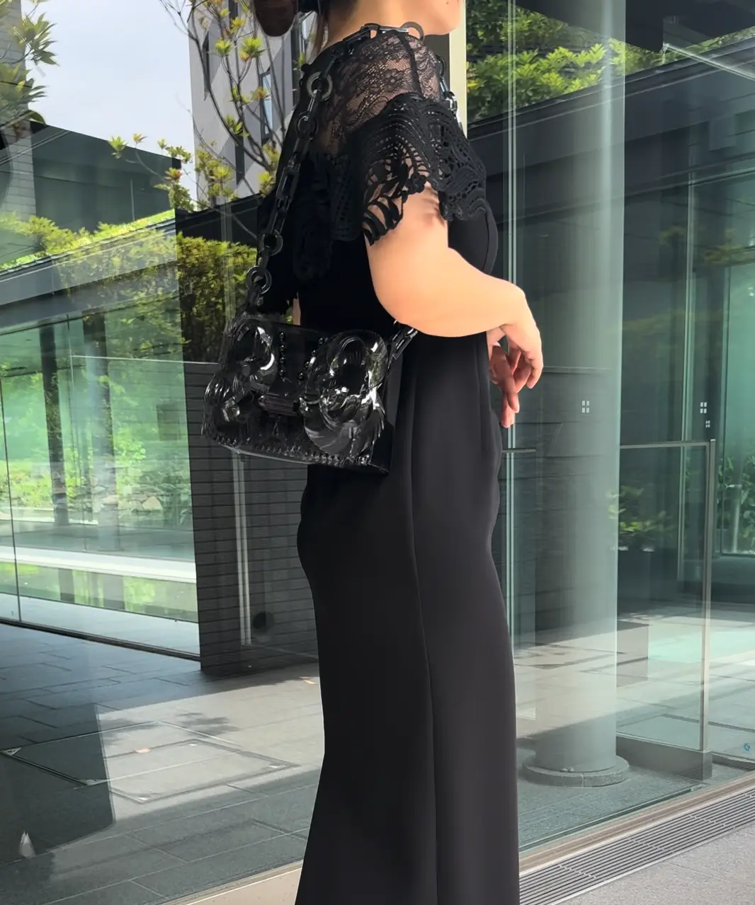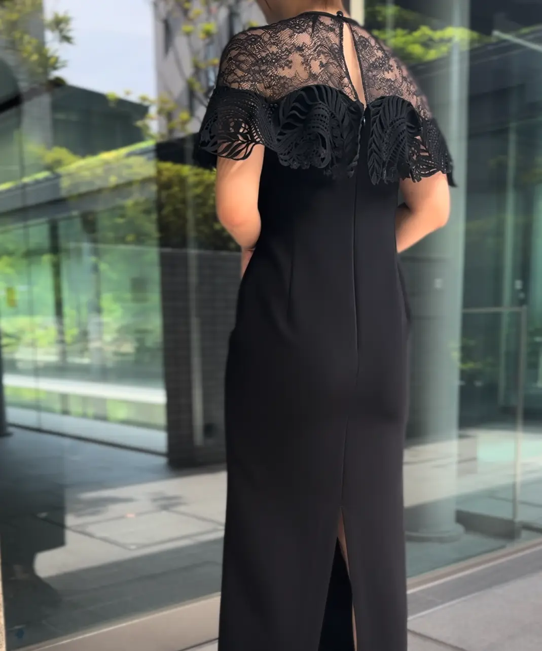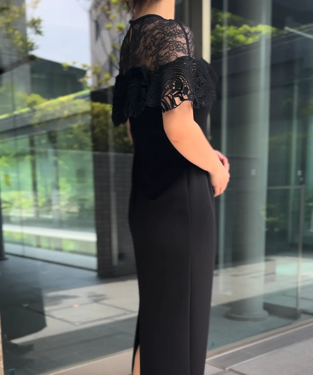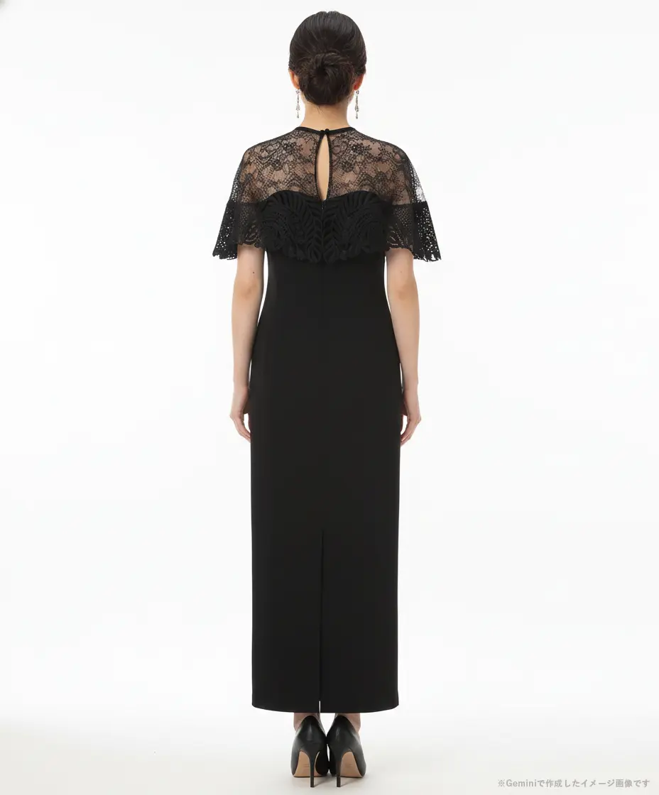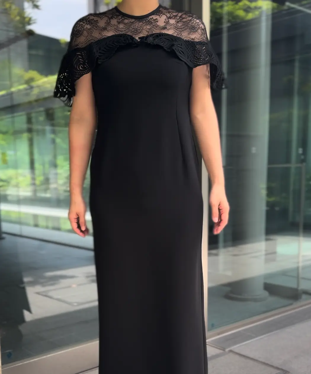 当店イチオシのラッセルレースドレスをご紹介します!トリアセテートとポリエステルのジョーゼット素材が、ストレッチ性と速乾性を両立。接触冷感機能付きでシワになりにくく、お手入れも簡単です。デコルテには自慢の花柄ラッセルレースと刺繍をあしらい、首元から肩にかけての可憐さが魅力。シェイプされたウエストから流れるシルエットが美しい縦ラインを強調し、着るだけでスタイルアップ!特別な日に着たい一着です。
