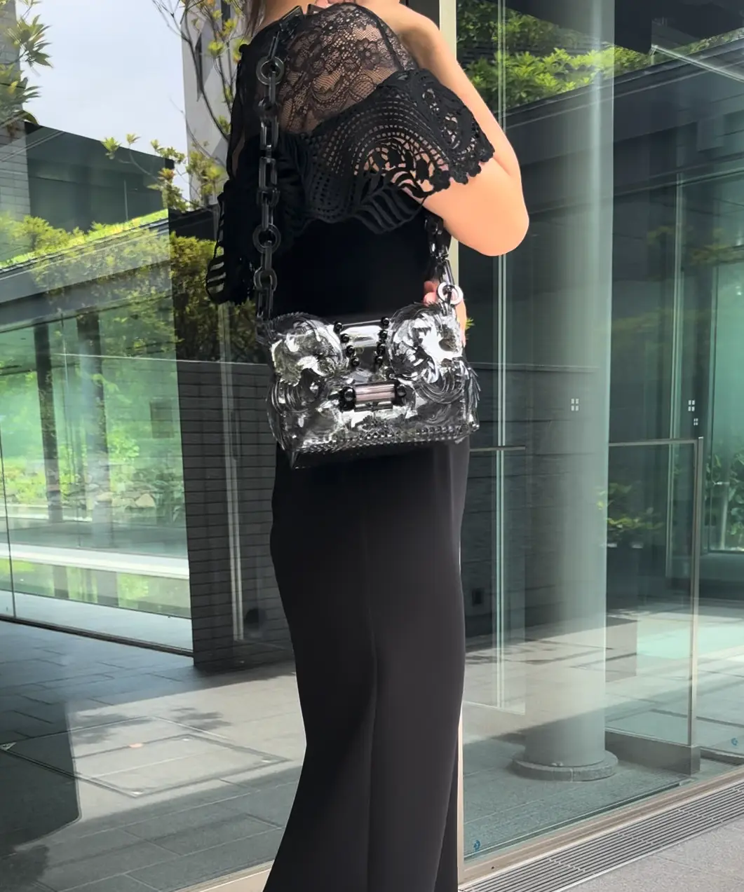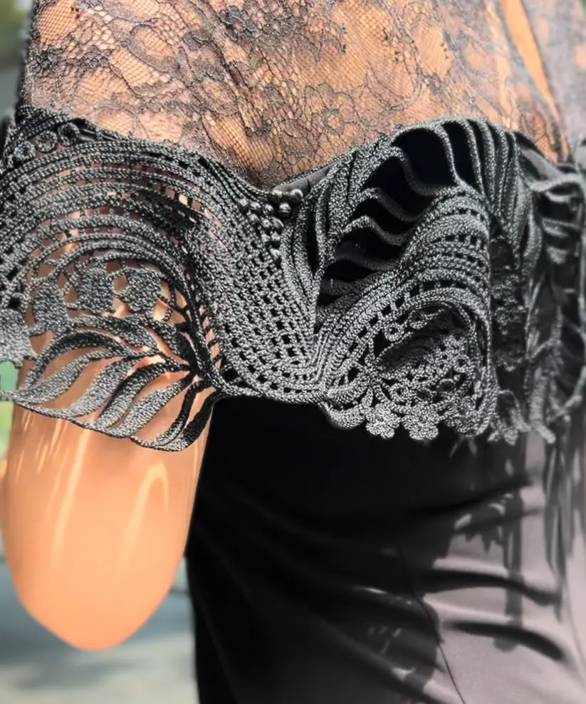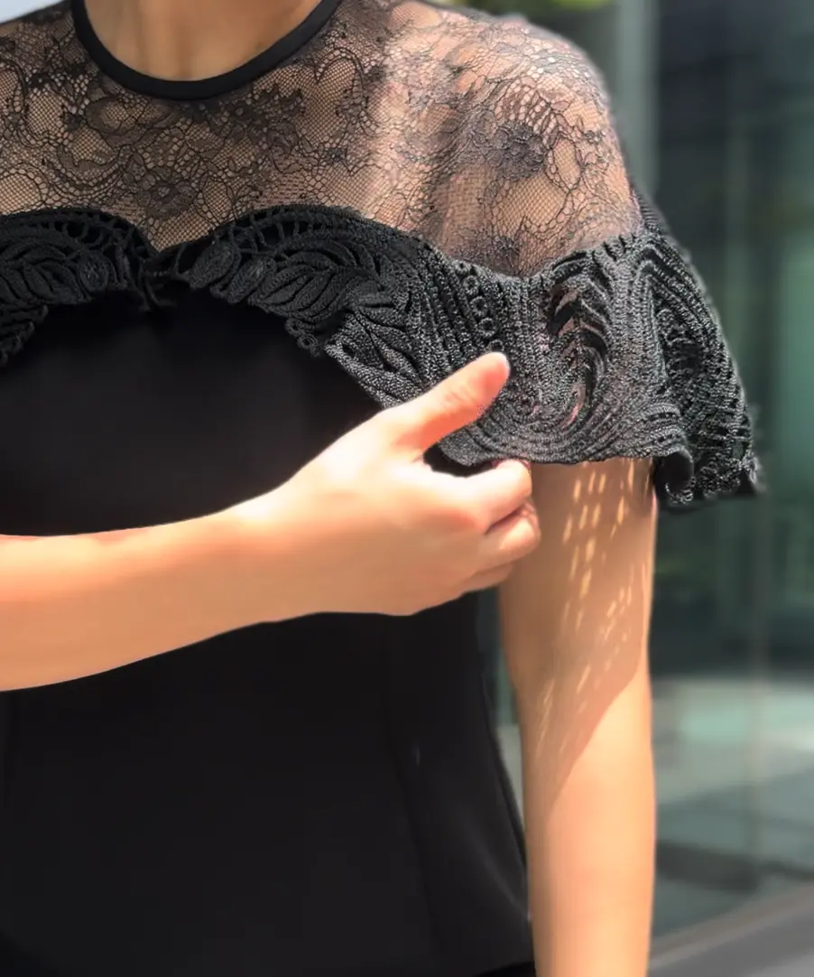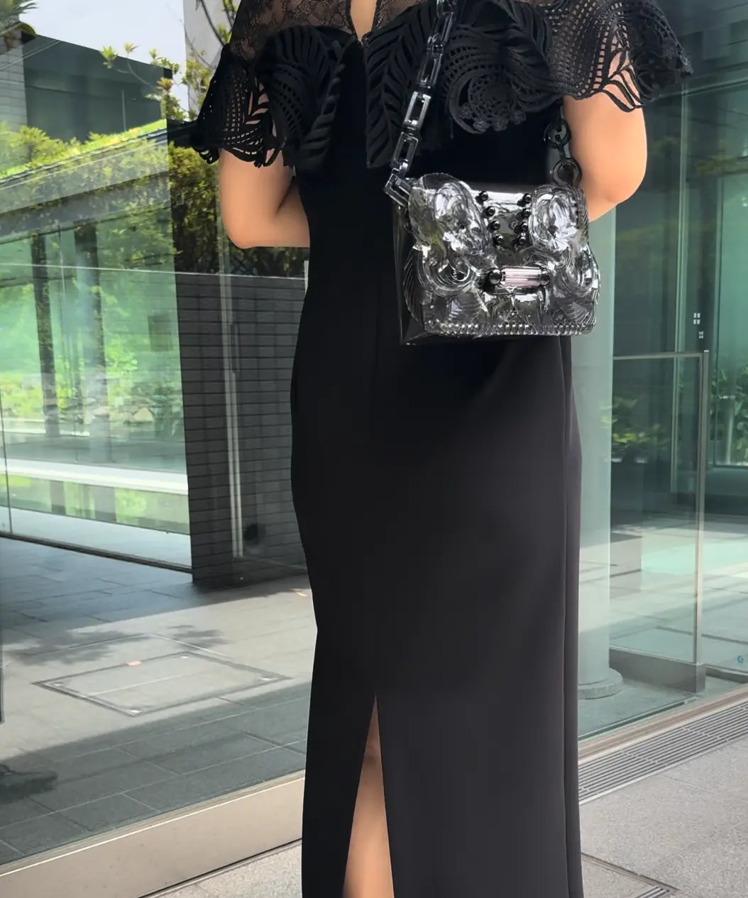 当店イチオシのラッセルレースドレスをご紹介します!トリアセテートとポリエステルのジョーゼット素材が、ストレッチ性と速乾性を両立。接触冷感機能付きでシワになりにくく、お手入れも簡単です。デコルテには自慢の花柄ラッセルレースと刺繍をあしらい、首元から肩にかけての可憐さが魅力。シェイプされたウエストから流れるシルエットが美しい縦ラインを強調し、着るだけでスタイルアップ!特別な日に着たい一着です。