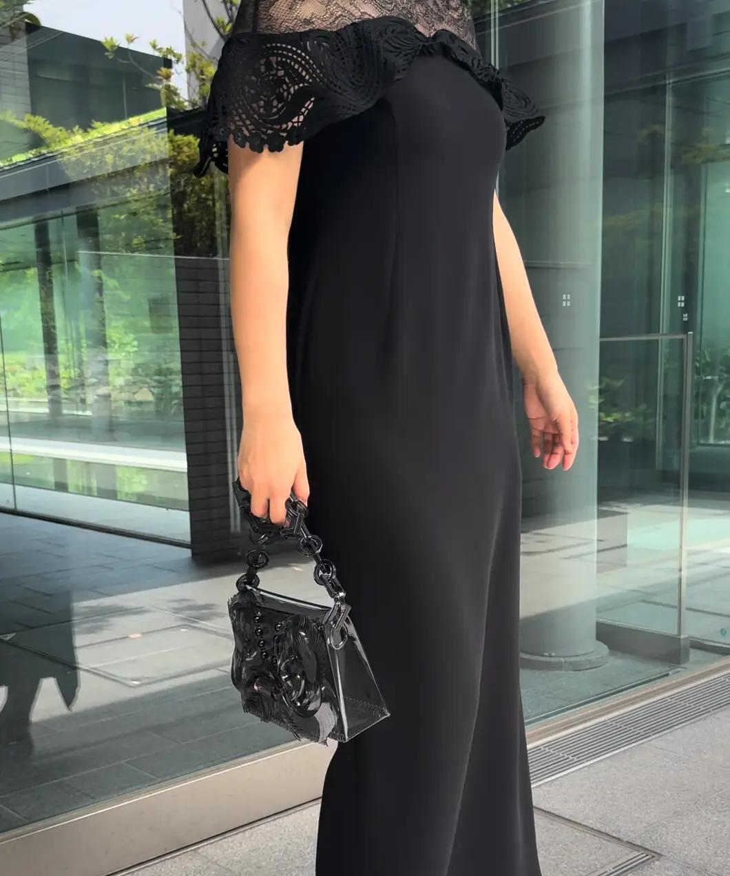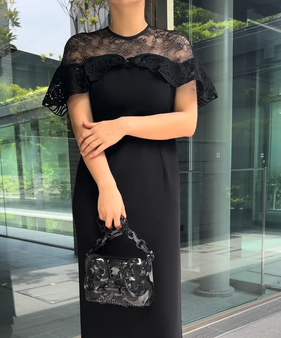 トリアセテートとポリエステルのジョーゼットを使用した贅沢なラッセルレースドレスです。特殊な膨らみのある糸を採用し、高いストレッチ性と速乾性を実現。接触冷感機能も備え、シワになりにくい優れた着心地をお約束します。デコルテには当店オリジナルの花柄ラッセルレースと繊細な刺繍をあしらい、首元から肩にかけて可憐な印象に。シェイプされたウエストから自然に落ちるシルエットが縦のラインを美しく強調し、スタイルアップ効果も抜群です。