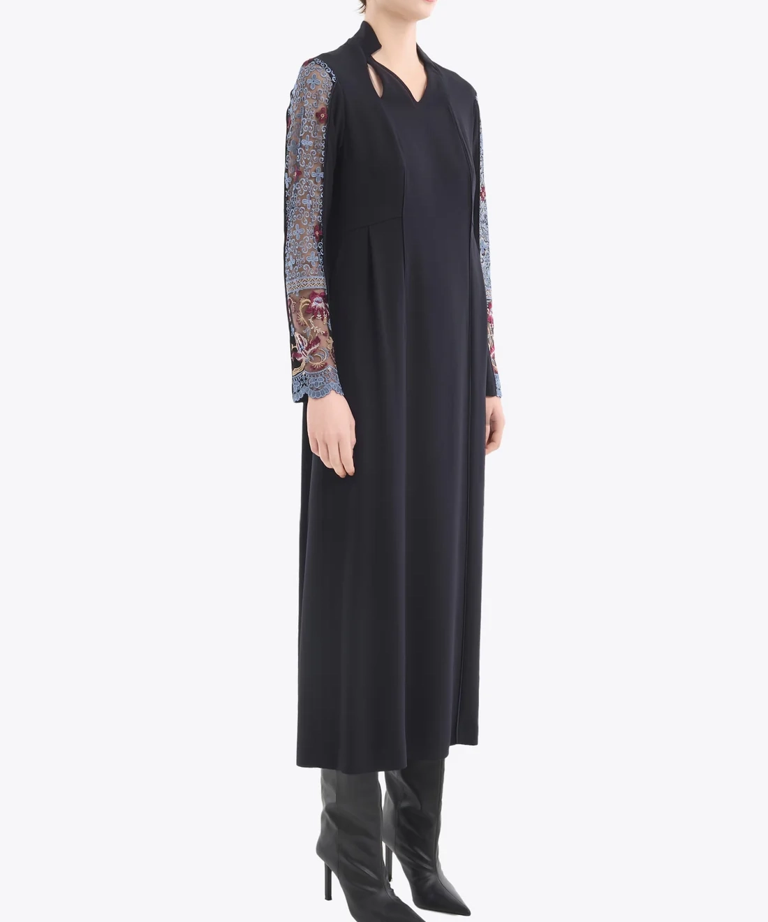 土台生地には発色に優れたアセテート混素材を採用し、レース柄がくっきり映える深みと奥行きをプラス。シンプルながらアートピースのような存在感を放つドレスです。