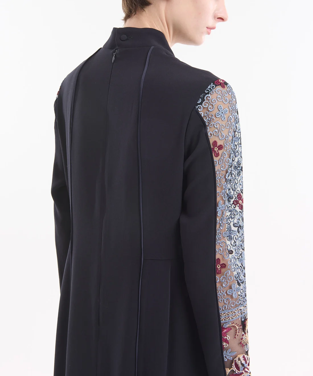 採用したのは、2019年SSシーズンに初めて制作されたオリジナル柄のエンブロイダリーレース。絵画のように描かれた花モチーフは、美しさの中にほのかな妖しさを秘めています。