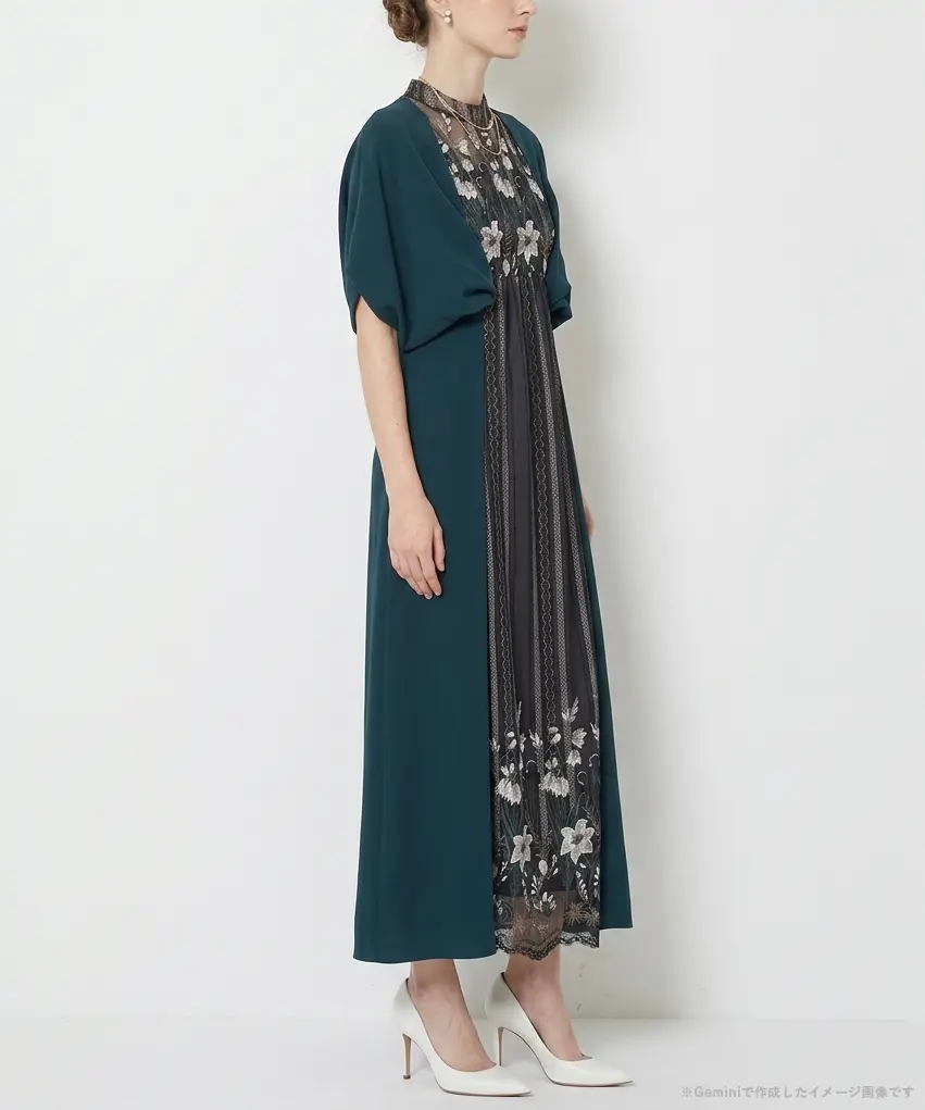 縦ラインを意識した刺繍の配置とウエスト部分が絞られてタックが入っているので自然に立体感が作られ、スタイルアップいたします。