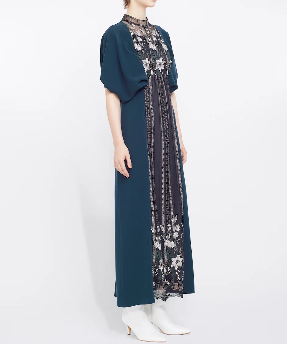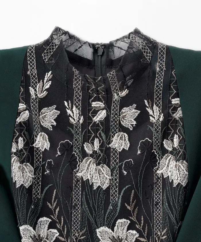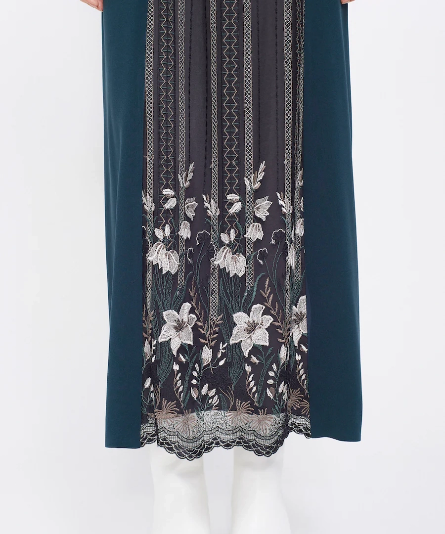 フリージアのモチーフを総刺繍で描いた一枚。縦ラインの切り替えと緩やかなAラインでスタイルアップが叶います。脇ポケット付きで実用性も◎。華奢なジュエリーや細ベルトで表情を変えて、ドラマチックなオケージョンに。