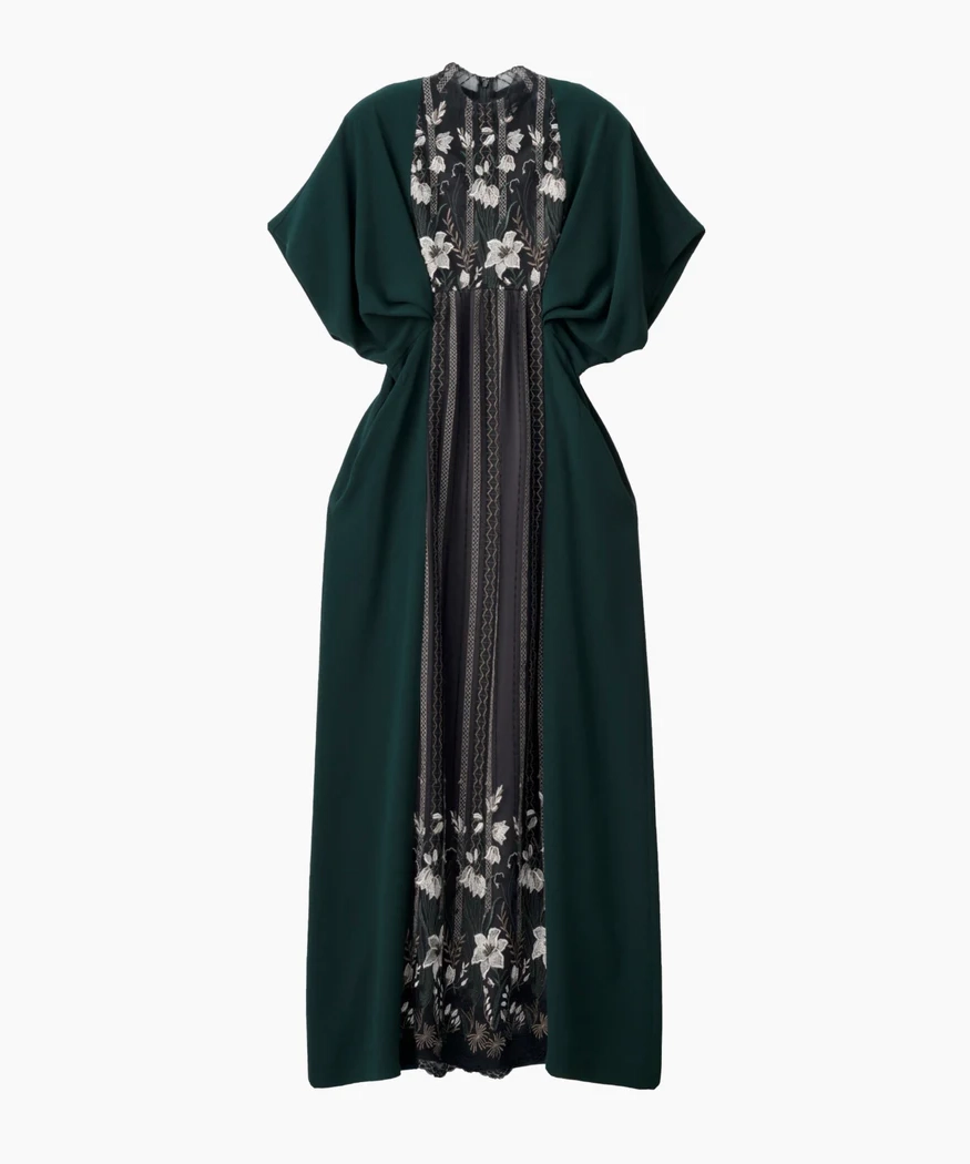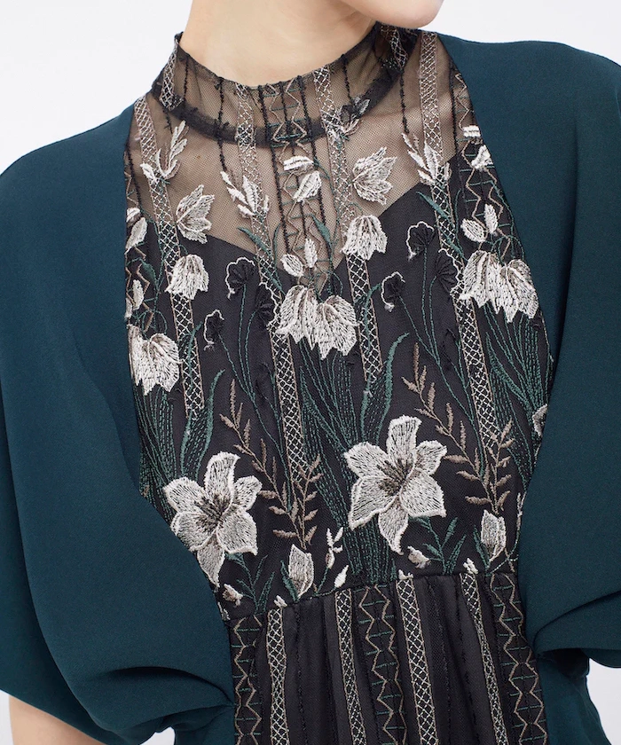 フリージアのモチーフを総刺繍で描いた一枚。縦ラインの切り替えと緩やかなAラインでスタイルアップが叶います。脇ポケット付きで実用性も◎。華奢なジュエリーや細ベルトで表情を変えて、ドラマチックなオケージョンに。