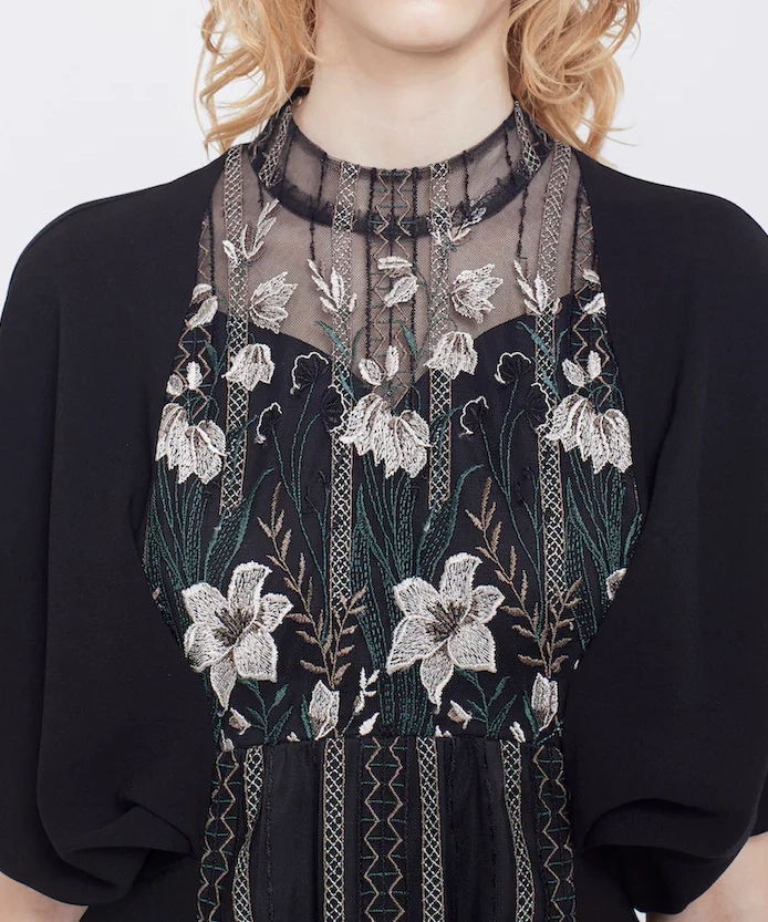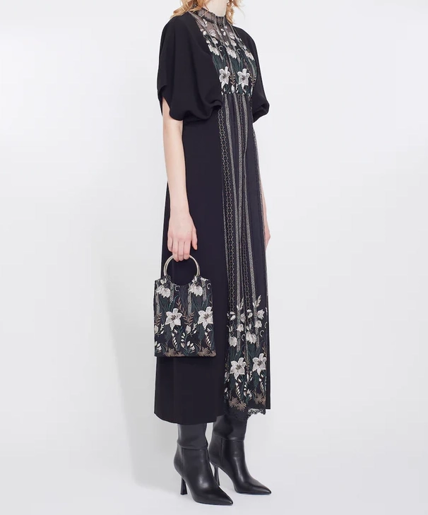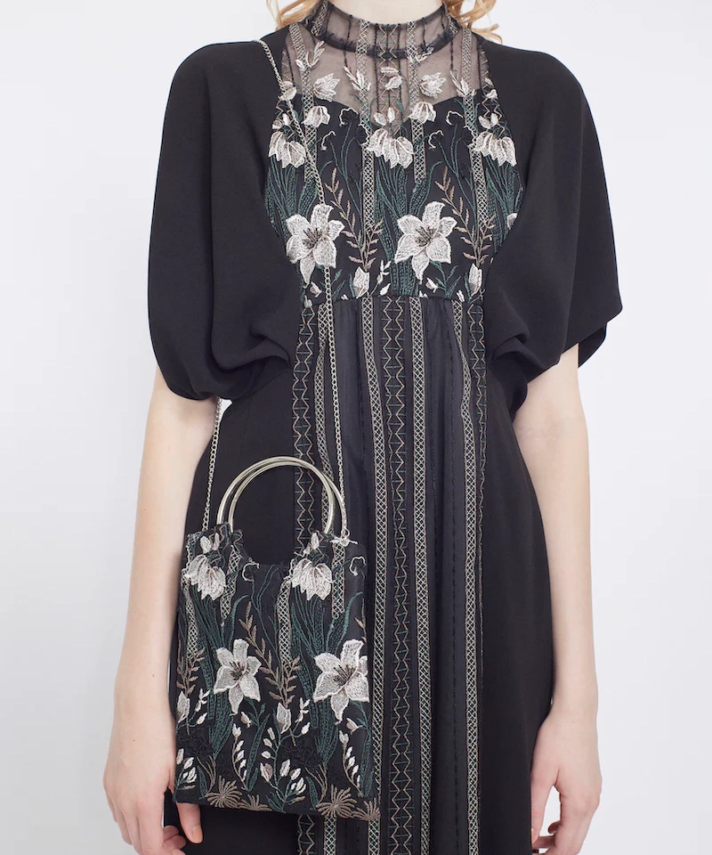 フリージアのモチーフを総刺繍で描いた一枚。縦ラインの切り替えと緩やかなAラインでスタイルアップが叶います。脇ポケット付きで実用性も◎。華奢なジュエリーや細ベルトで表情を変えて、ドラマチックなオケージョンに。