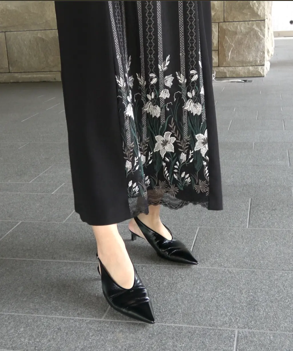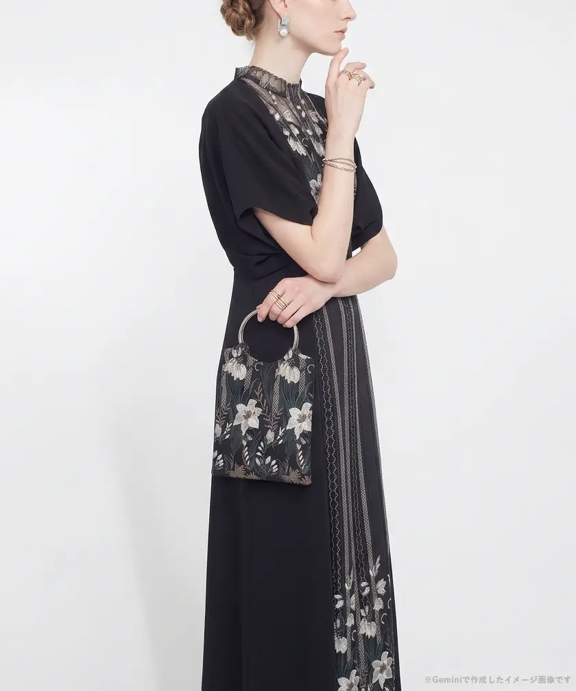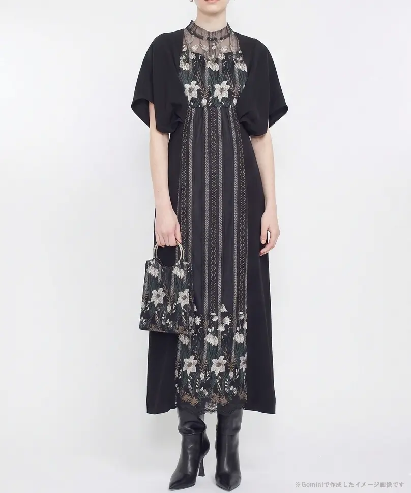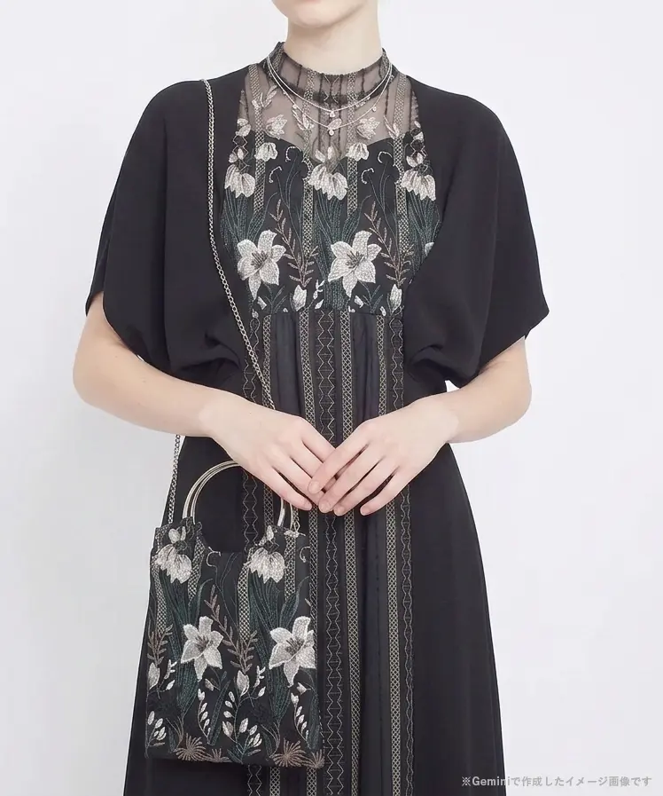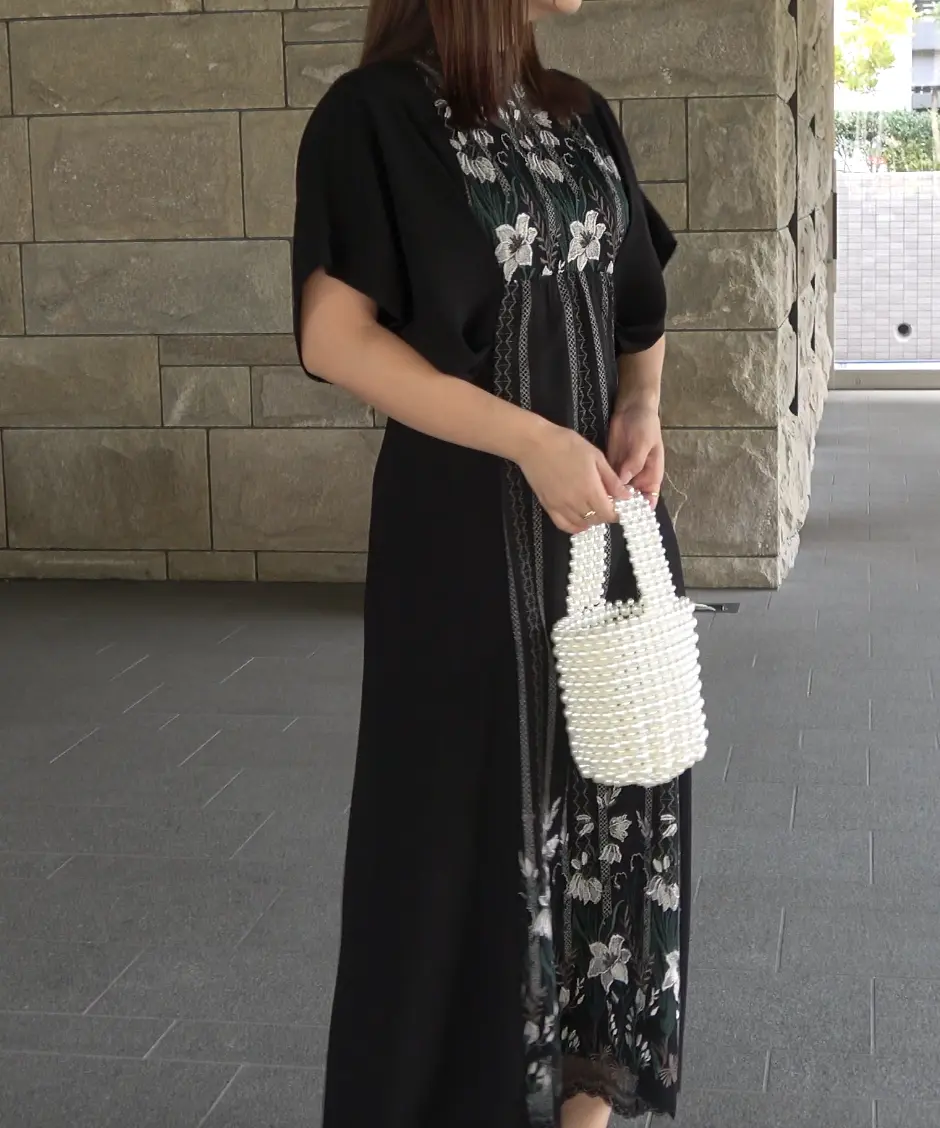 フリージアのモチーフを総刺繍で描いた一枚。縦ラインの切り替えと緩やかなAラインでスタイルアップが叶います。脇ポケット付きで実用性も◎。華奢なジュエリーや細ベルトで表情を変えて、ドラマチックなオケージョンに。