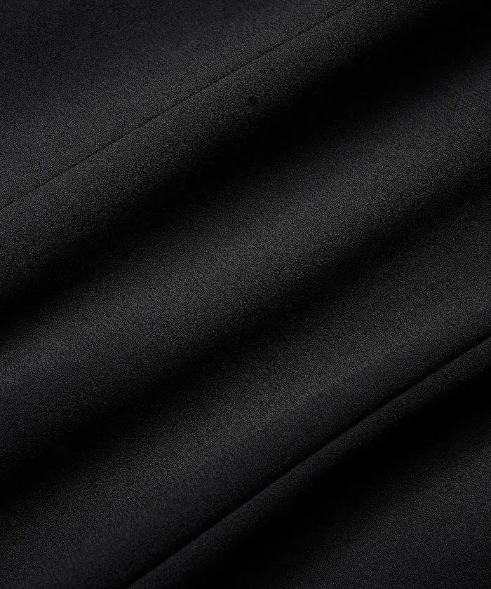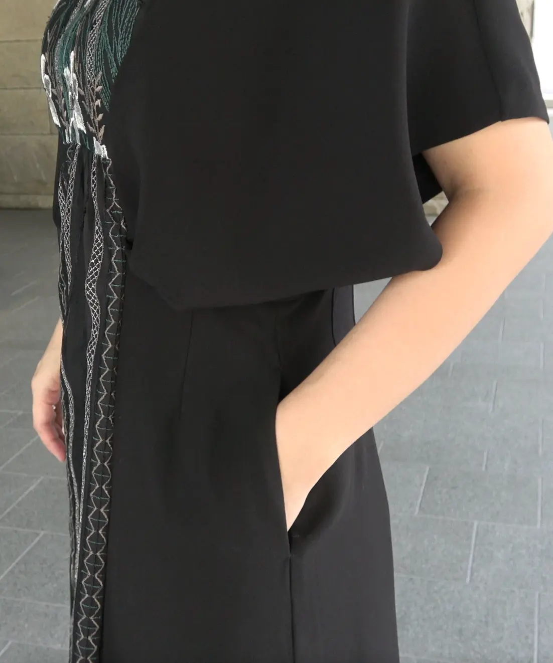 縦ラインを意識した刺繍の配置とウエスト部分が絞られてタックが入っているので自然に立体感が作られ、スタイルアップいたします。