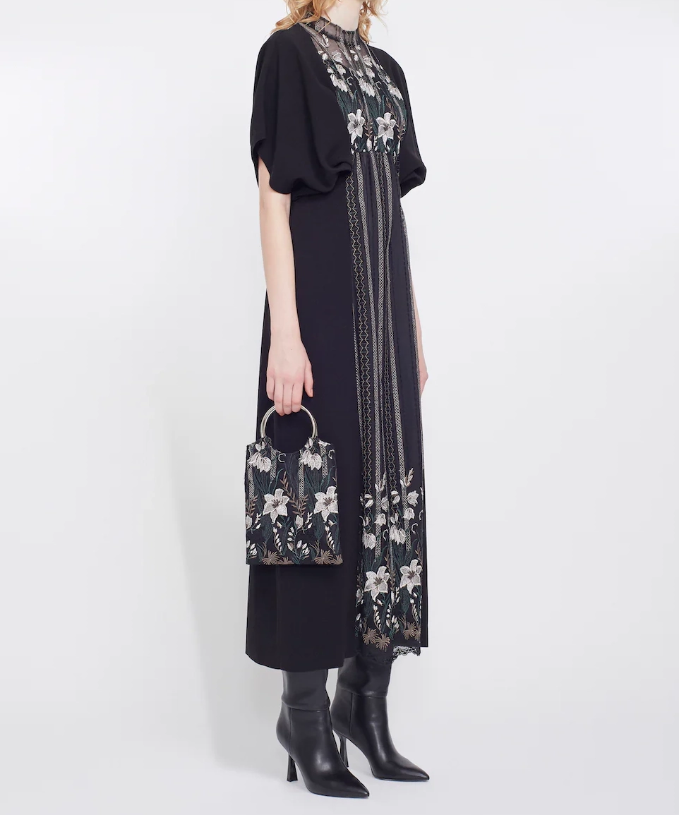 Classic lace bag(Black)。デザイナー関口による手描きモチーフをもとにしたフリージアのオリジナル刺繍レースを採用。チェーンは着脱可能で、肩がけから手持ちまでシーンに合わせてアレンジ可能。2026SSのテーマ“GLEAM(淡いきらめき)”を感じる、凛としたエレガンスを添える一品です。